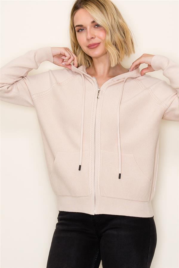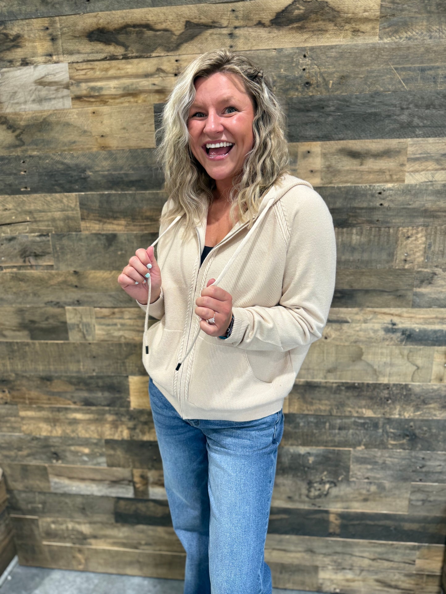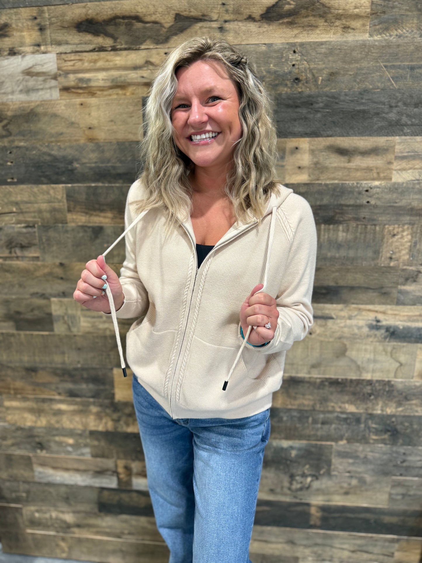 Experience understated elegance with the Omni Oatmeal Cardigan. This long-sleeve hoodie sweater jacket features a refined waffle texture and a practical drawstring neck paired with a smooth zip-up front. Made from a soft blend of viscose and nylon, it offers a true-to-size fit with a hint of extra room for comfortable layering. Perfectly suited for adding a sophisticated touch to your casual wardrobe, this oatmeal-toned piece balances comfort and style effortlessly.