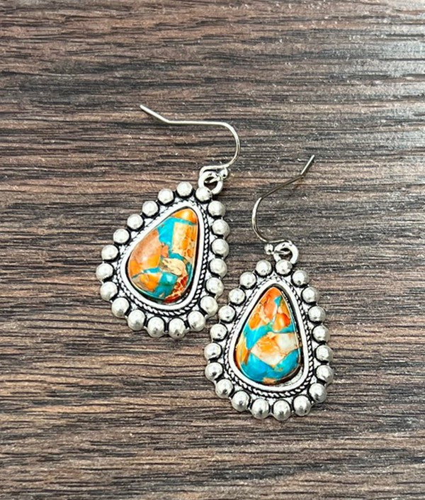 Add some western flair to your outfit with our Rodeo Gemstone Earrings! These 1.3" long earrings feature unique gemstones and silver accents, adding a touch of natural beauty to your look. Each earring weighs 8 grams and comes with a fish hook for easy wear. (Yeehaw! Each stone is naturally unique.)
