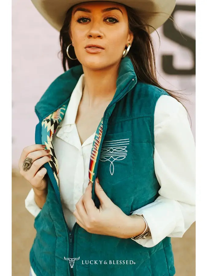 Step into bold Western comfort with our Boot Stitch Embroidered Rodeo Vest from Lucky & Blessed. Crafted for the modern cowgirl, this sleeveless vest features a rich fabric with quilted padding, delivering warmth without the bulk. A high collar adds edge and structure, while the front zip closure ensures a secure, flattering fit. The standout feature is the intricate white Western embroidery, stitched on both the chest pocket and across the back yoke - evoking classic rodeo flair with a modern twist. Spacious hand pockets provide functionality and laid-back charm.