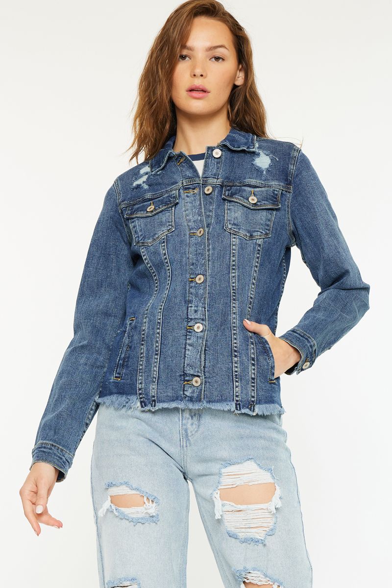 Introducing The Frenchie Jacket! Made with a dark wash and stretch material, this denim jacket features a stylish 4 pocket design and a frayed hem for a unique touch. With a length of 23.5" in size M, this jacket is both comfortable and fashionable. Made of 98% cotton and 2% spandex. (Dog not included.)