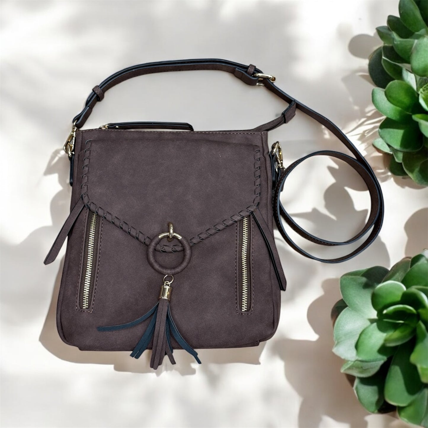 Take on the day with the Layla crossbody, featuring two front zip pockets for easy access to your essentials. The front flapover pocket adds a playful touch with its braided edge, decorative ring, and tassel. The adjustable strap allows for hands-free convenience, while the dimensions of 10"x10"x2" provide just enough space. (Espresso color)