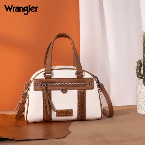 Add a touch of fun to your outfit with the Wrangler Whipstitch Crossbody Handbag in Cream. Featuring charming whipstitch details and a bold Wrangler logo applique, this bag combines style and practicality. Keep essentials secure with a front zipper pocket and top zipper closure, while two inside open pockets help you stay organized. Carry it your way with a double flat handle or an adjustable, detachable crossbody strap for hands-free convenience. Compact yet roomy at 10" x 4.3" x 8", it’s the perfect playful companion for any adventure.