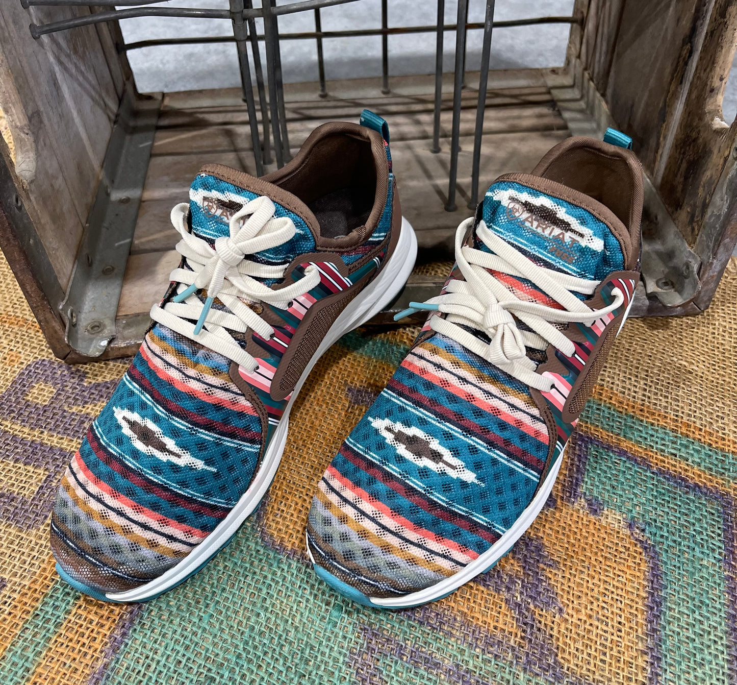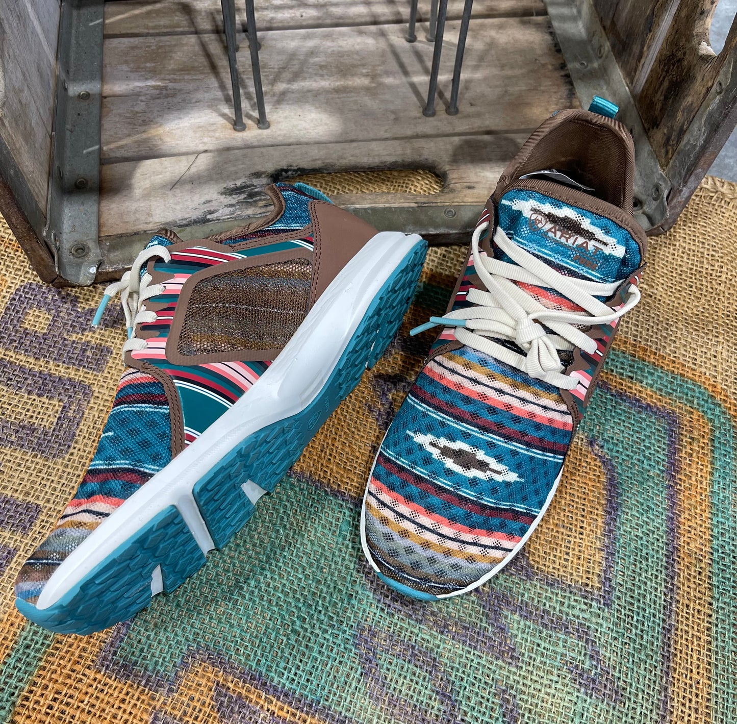 Style and function in this pastel turquoise serape athletic shoe. Cushion and support.
