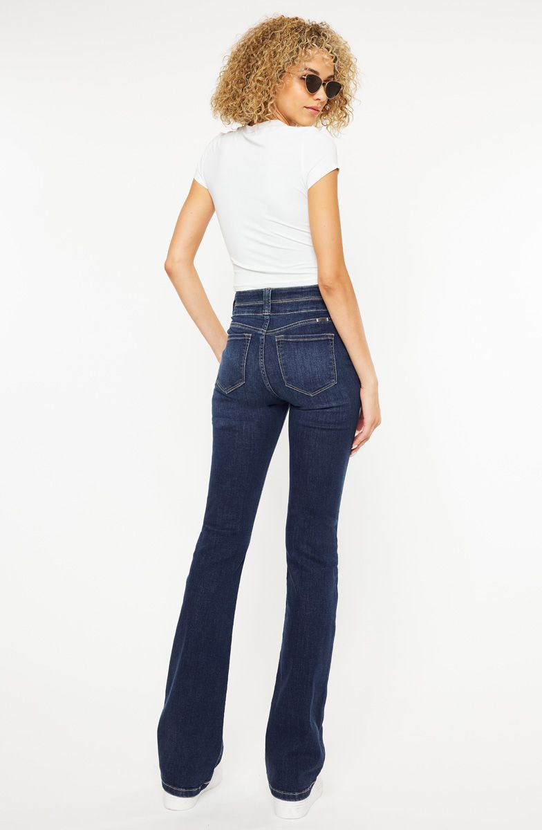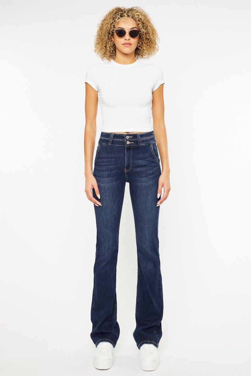 Rock your everyday look with Babs Bootcut Jeans. These HIGH RISE UTILITY BOOTCUT jeans by KanCan offer a dark stone wash and super stretch for comfort and style. With a 2-button waistband and curve back yoke, they provide a flattering fit. Available in size 5/26 with 11" rise and 33" inseam in size 5/26. Made of 68% cotton, 30% polyester, and 2% lycra.