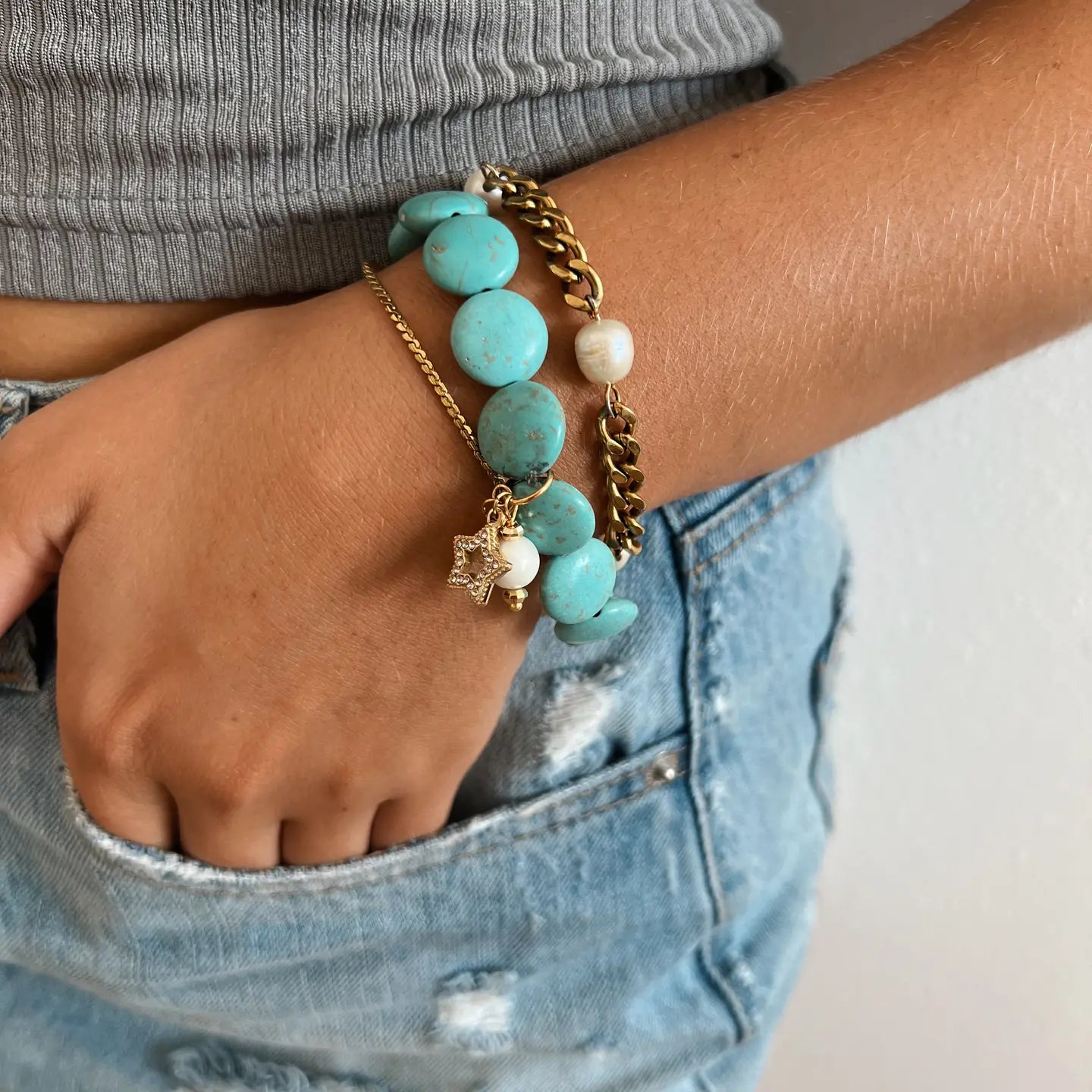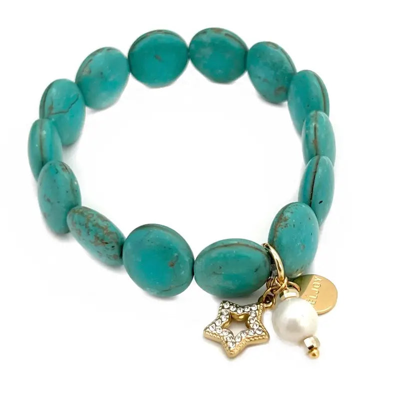 Get ready to add a pop of color to your stack with the Bethany Turquoise Charm Bracelet! Featuring round turquoise beads and the cutest star and pearl charms, this bracelet is perfect for adding a touch of playfulness to any outfit. Crafted with semi-precious stones and gold plated brass charms, this 7" stretch bracelet is a must-have for any fun-loving fashionista!