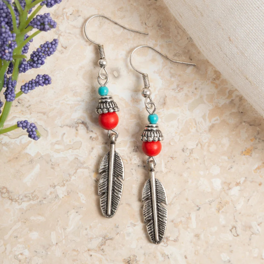 These silver feather earrings are accented by red and turquoise beads to give them the additional pop they need. Classic silver fishhook backs.