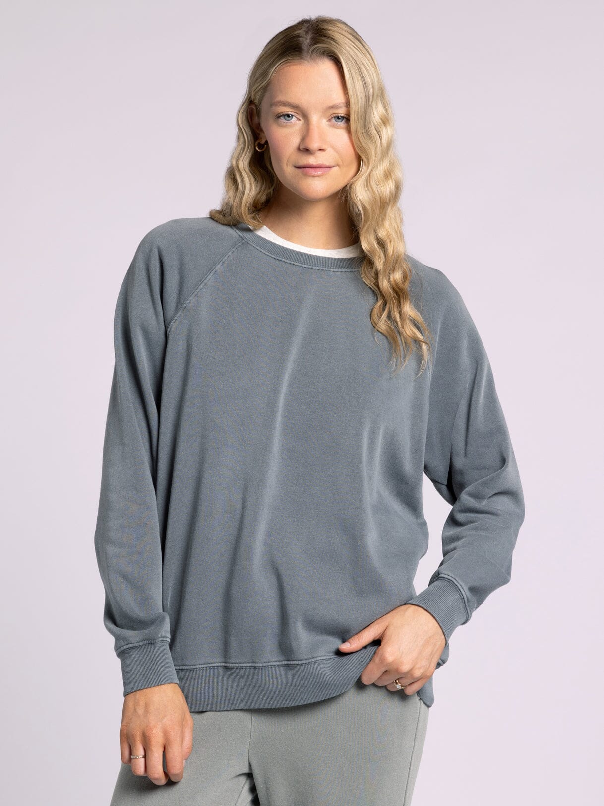 The Hangout Top in Stormy Weather offers a refined blend of comfort and style with its crew neckline and raglan sleeves. Crafted from a soft cotton-polyester mix, it features ribbed hems and cuffs for a polished finish. Designed to fit true to size, this top is perfect for effortless, sophisticated layering.
