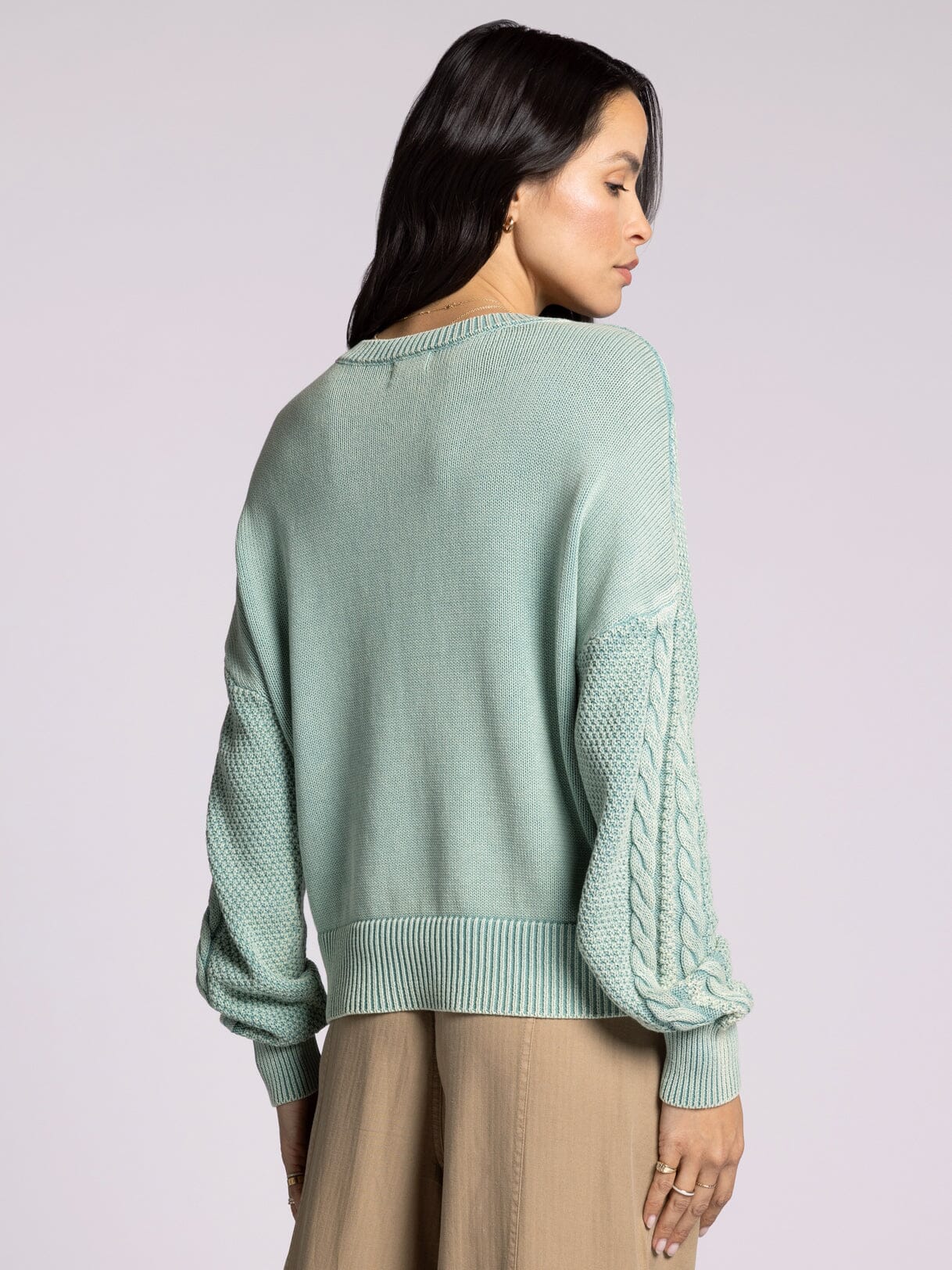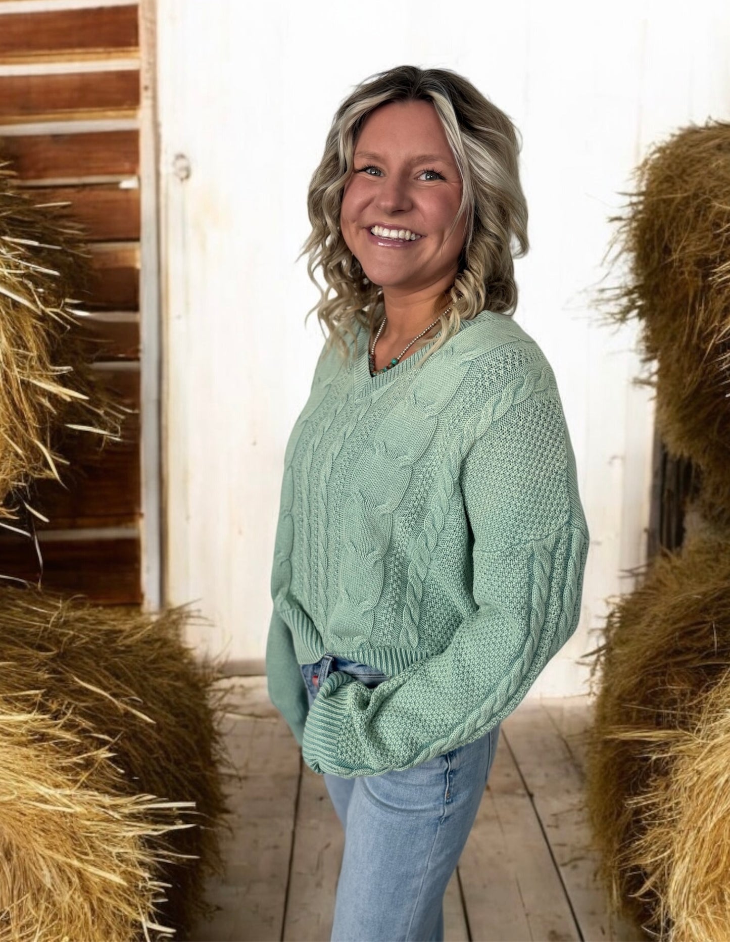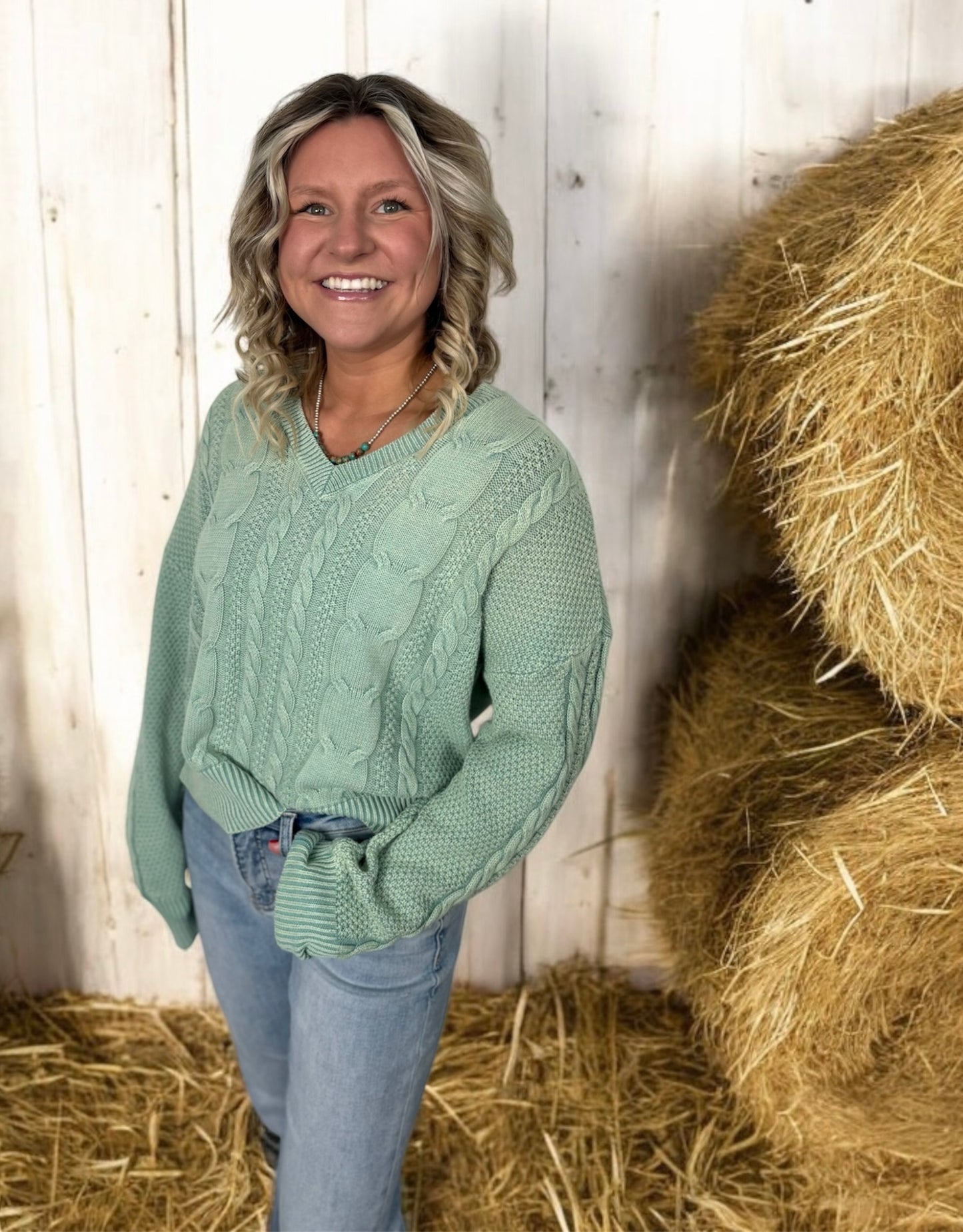 Regular price $40.99Introducing the Harriet Sweater, the perfect spring/summer addition to your wardrobe. This cable knit v-neck sweater in Blue Surf (seafoam green) is crafted from 100% cotton for a super soft feel. Stay comfortable and stylish all season long with the Harriet Sweater.