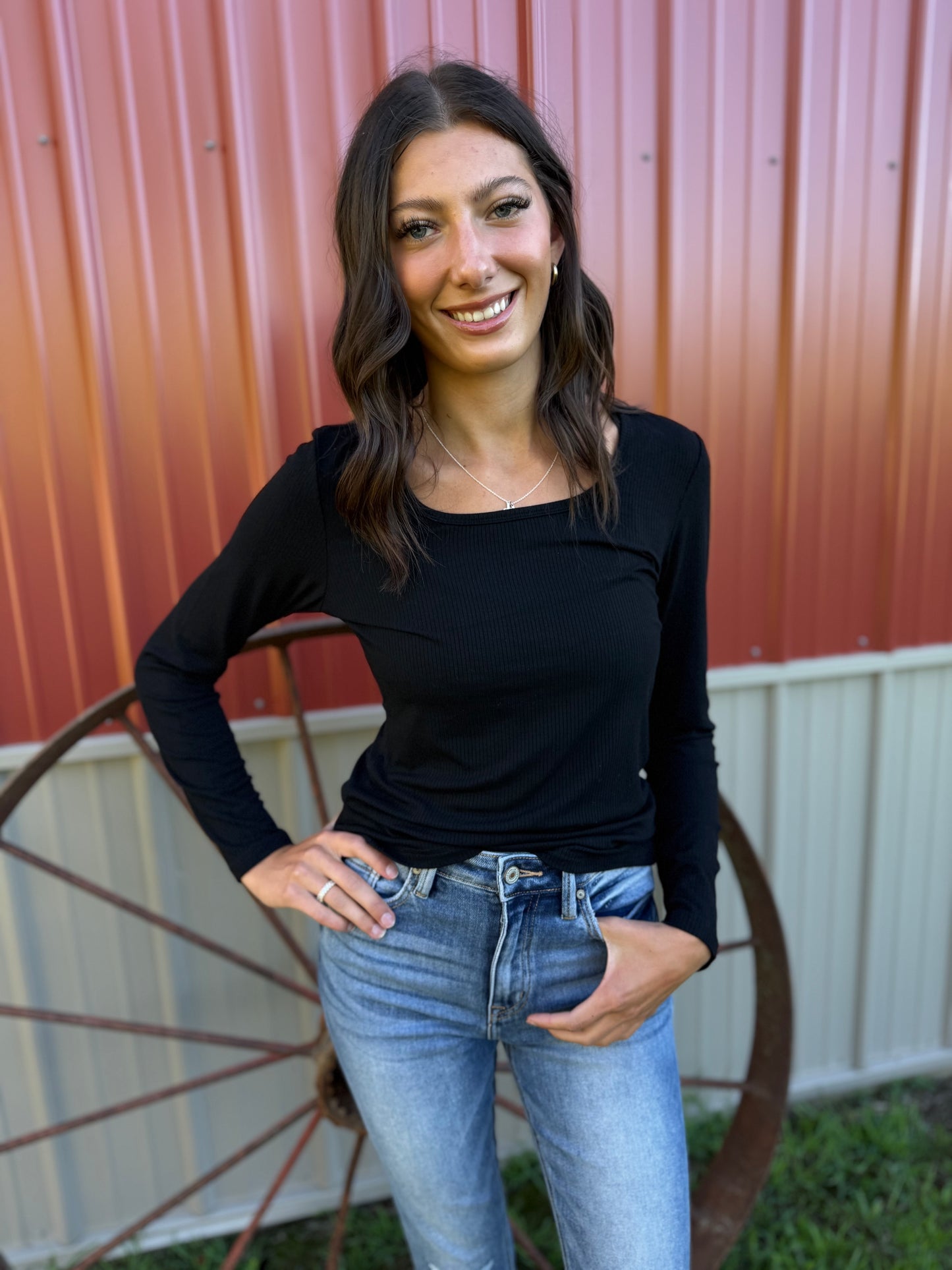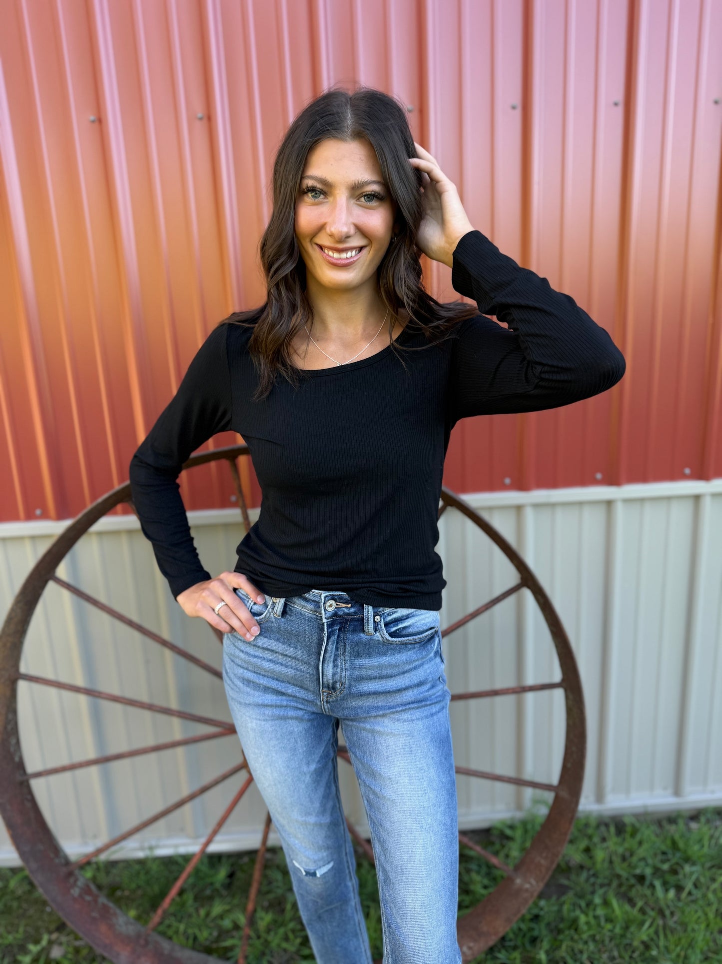 The Livi Long Sleeve Scoop Tee in Black offers timeless elegance paired with exceptional comfort. Made from a premium blend of soft, breathable fabrics, this ribbed long sleeve tee provides a luxurious feel and durability for everyday wear. Its fitted silhouette beautifully enhances your natural curves while maintaining ease of movement. The subtle ribbed texture adds refined detail, making it a sophisticated staple that effortlessly elevates your daily wardrobe.