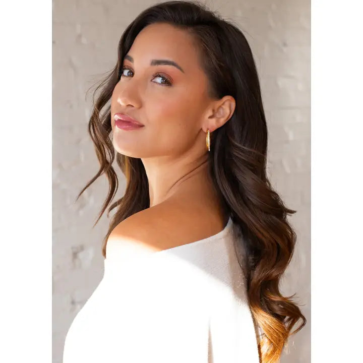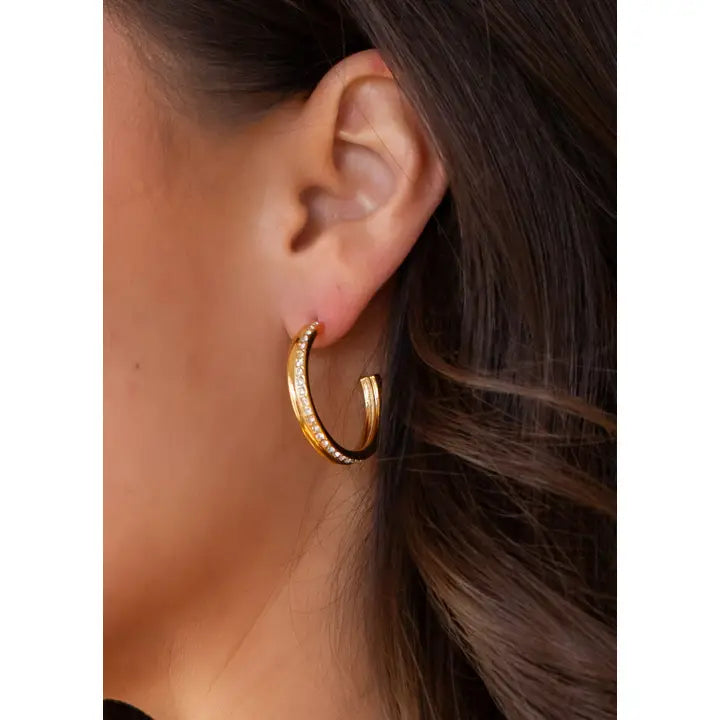 Be bold and fabulous with our Luxe Gold Rhinestone Hoops! These 18K gold earrings feature dazzling rhinestones, making a stylish statement. At 1.75" in diameter, they are the perfect size to add sparkle to any outfit. Plus, they're waterproof and made with stainless steel, ensuring they're both trendy and durable. Lead and nickel free for ultimate comfort.