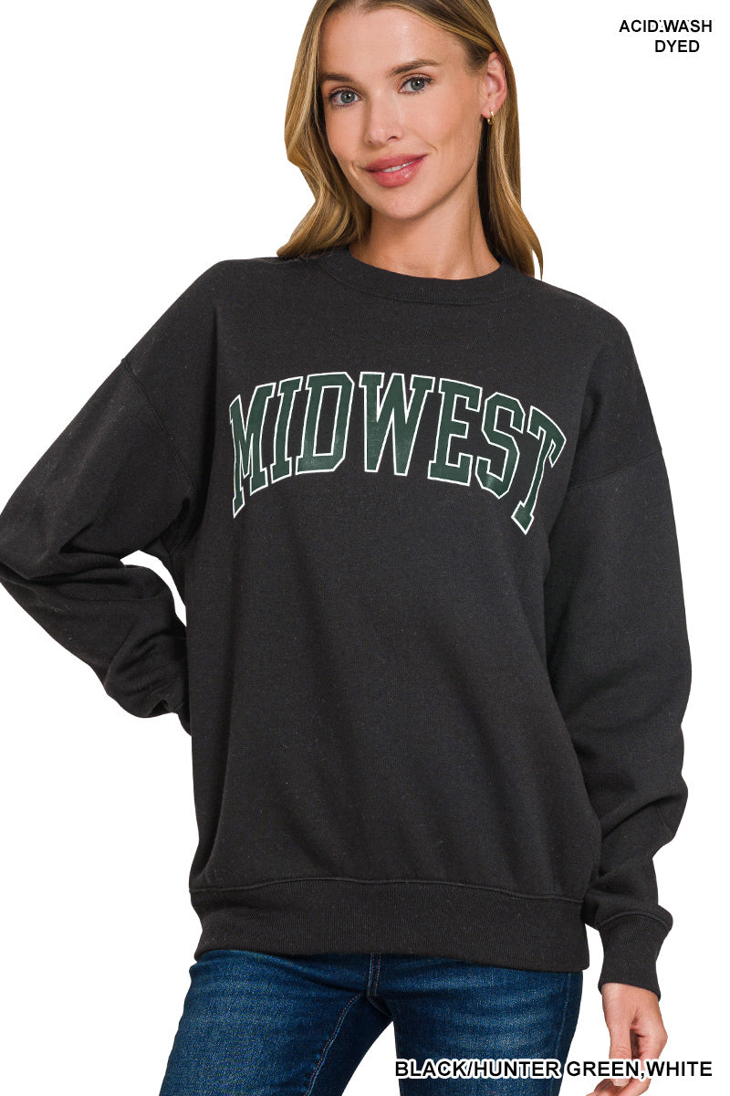 Show your Midwest pride with this cozy black crewneck sweatshirt! The forest green "Midwest" print adds a touch of regional flair to your casual wardrobe. Made from a snuggly cotton/polyester blend that keeps you comfy whether you're cheering at a football game or sipping hot cocoa by the fire. Fits true to size, so you can rock that perfect not-too-tight, not-too-loose Midwest vibe!