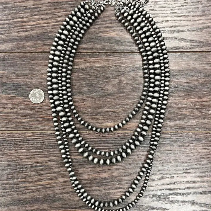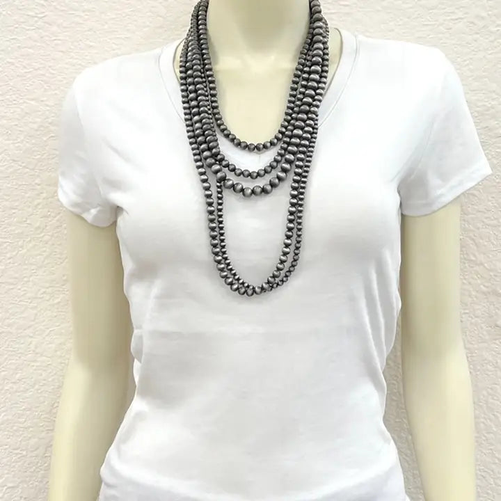 This Multi-Layered Navajo Bead Necklace is a handmade masterpiece with 5 strands of varying lengths (20"-30") for a unique, customizable look. Made with high-quality 8-10mm Navajo beads, it's a lightweight (120g) and nickel-free accessory that adds a touch of tribal flair to any outfit.