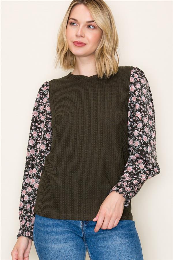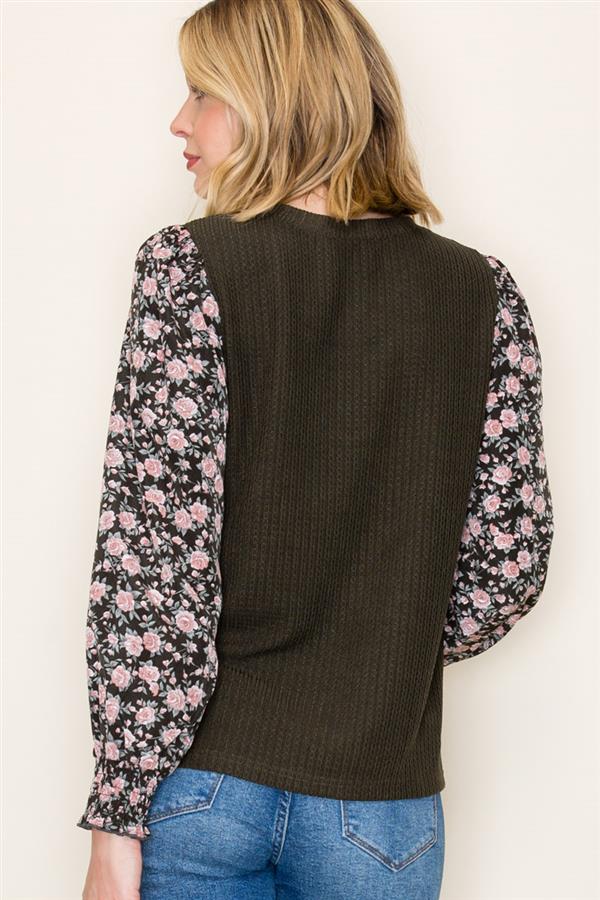 Bring a burst of charm to your wardrobe with the Oscar Olive Sweater featuring playful floral print smocked cuffs and long sleeves. Crafted with a cozy novelty knit body, this pullover top blends comfort and whimsy effortlessly—perfect for brightening up any day with a touch of fun flair.