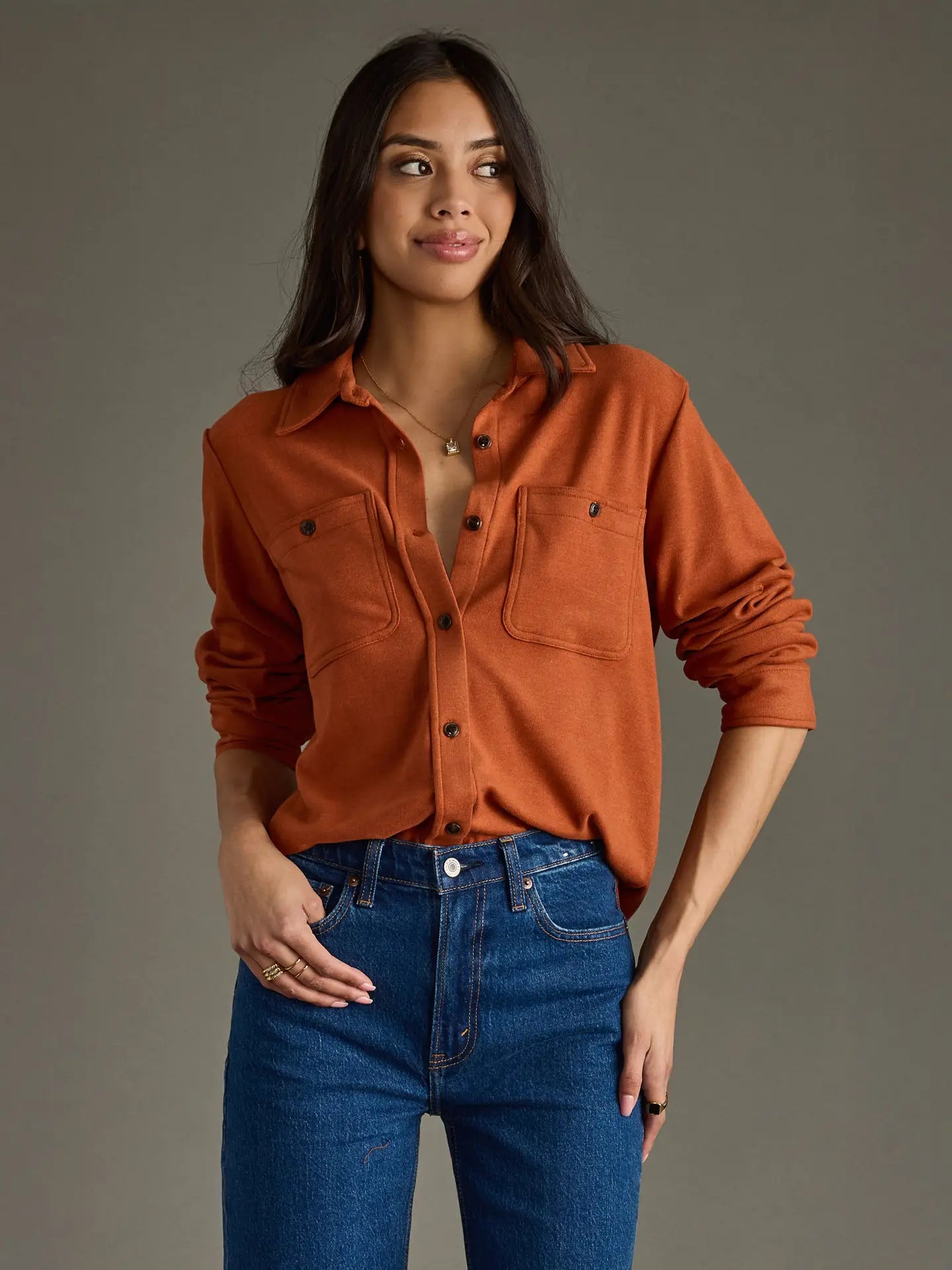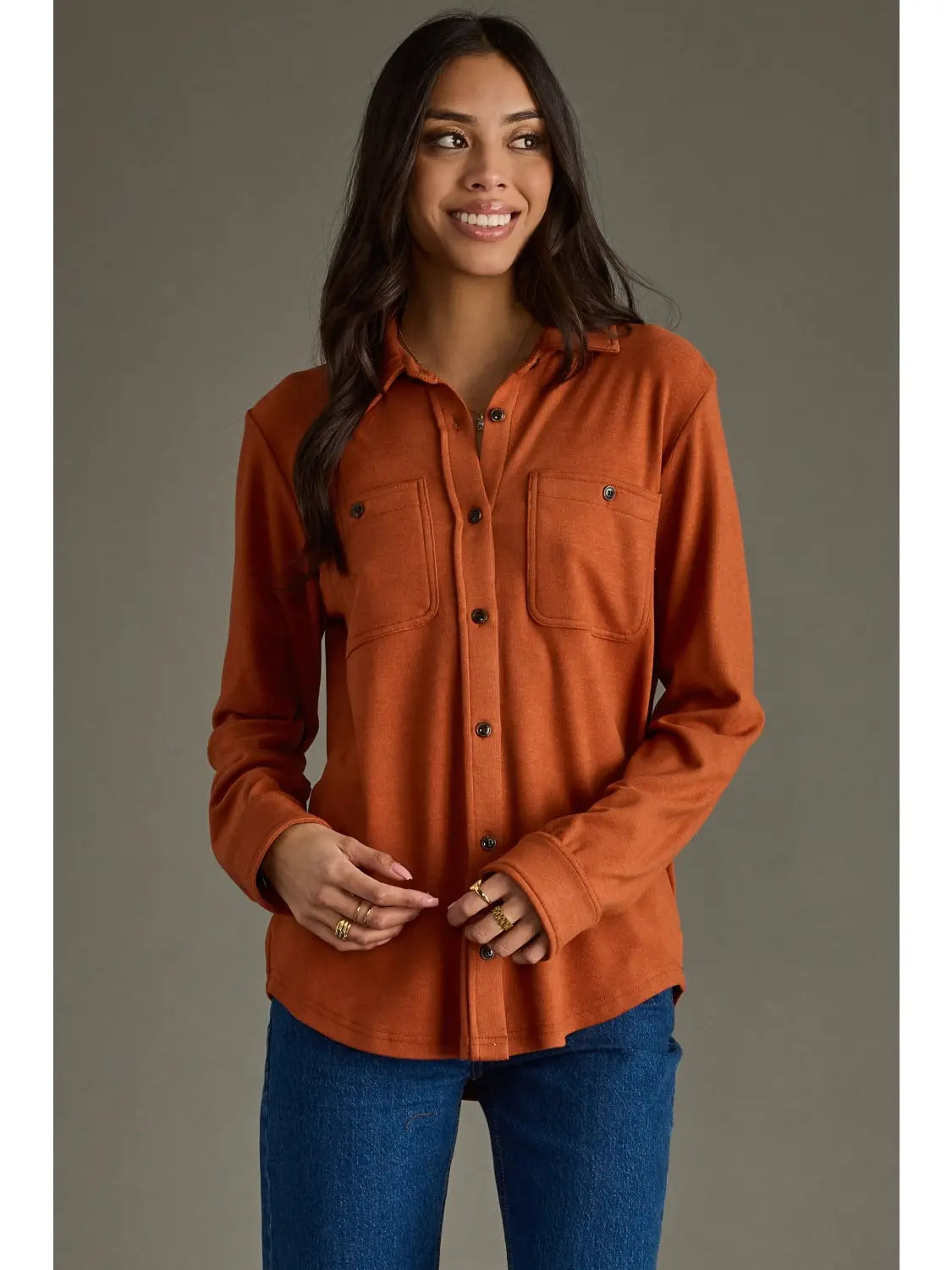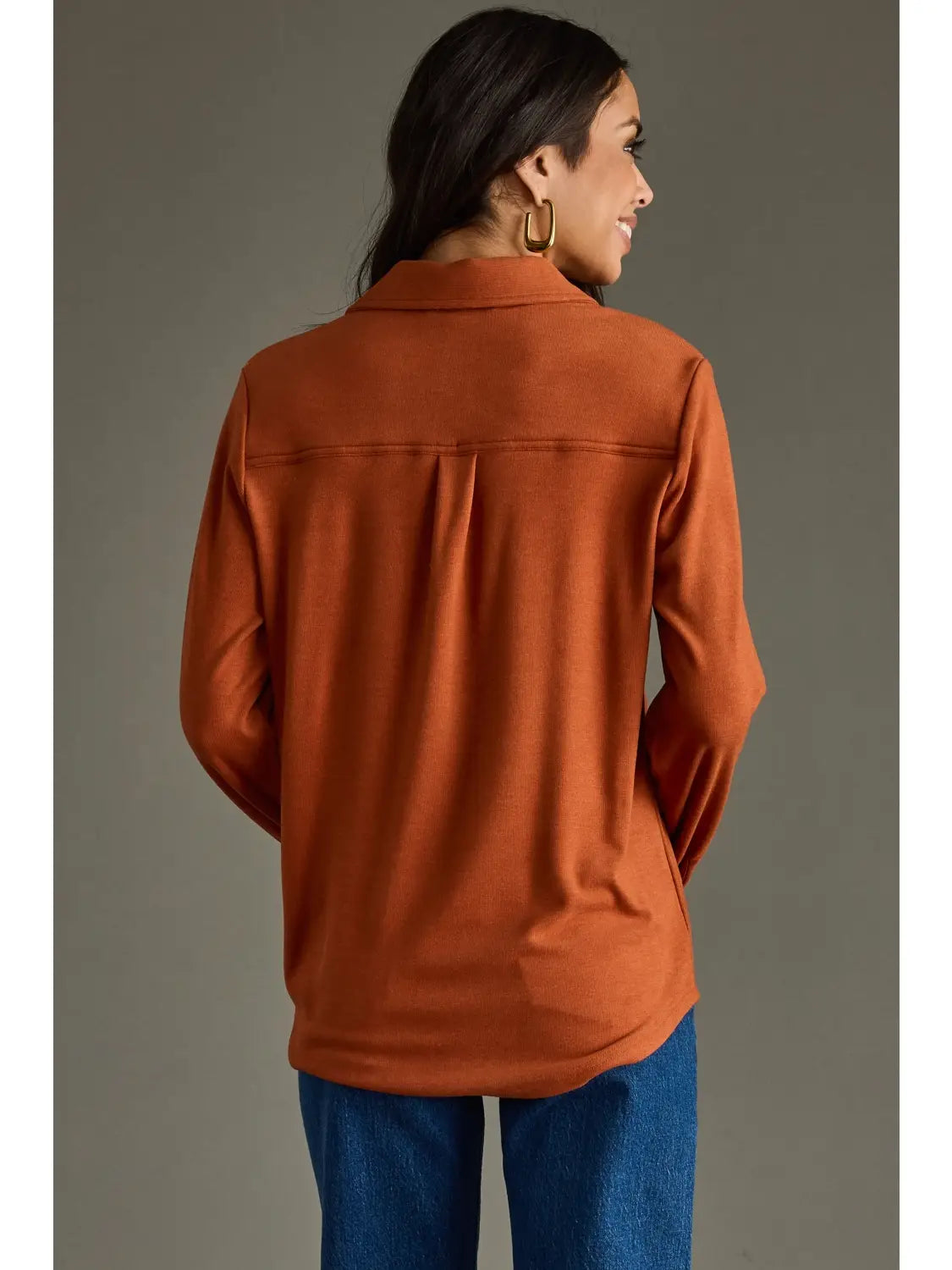 The Randi Super Soft Shirt in Rust combines elegance with comfort, featuring a front button closure and a flattering fit that offers extra room while staying true to size. Made from a premium blend of 75% rayon, 15% acrylic, and 10% spandex, this shirt delivers exceptional softness and a cozy feel, perfect for a polished yet relaxed look.