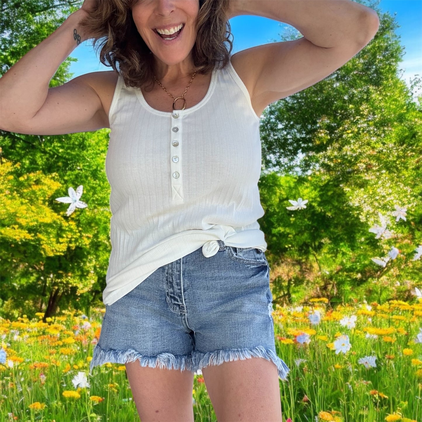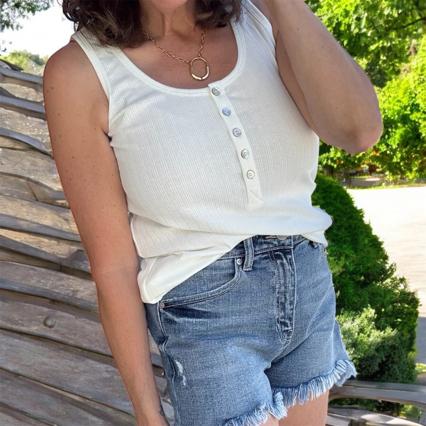 This ivory tank is perfect for summer with its ribbed texture and relaxed fit. The scoop neck adds a touch of femininity while the button tabs add a unique detail. Stay cool and stylish in this river ribbed tank.