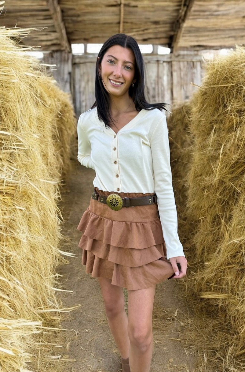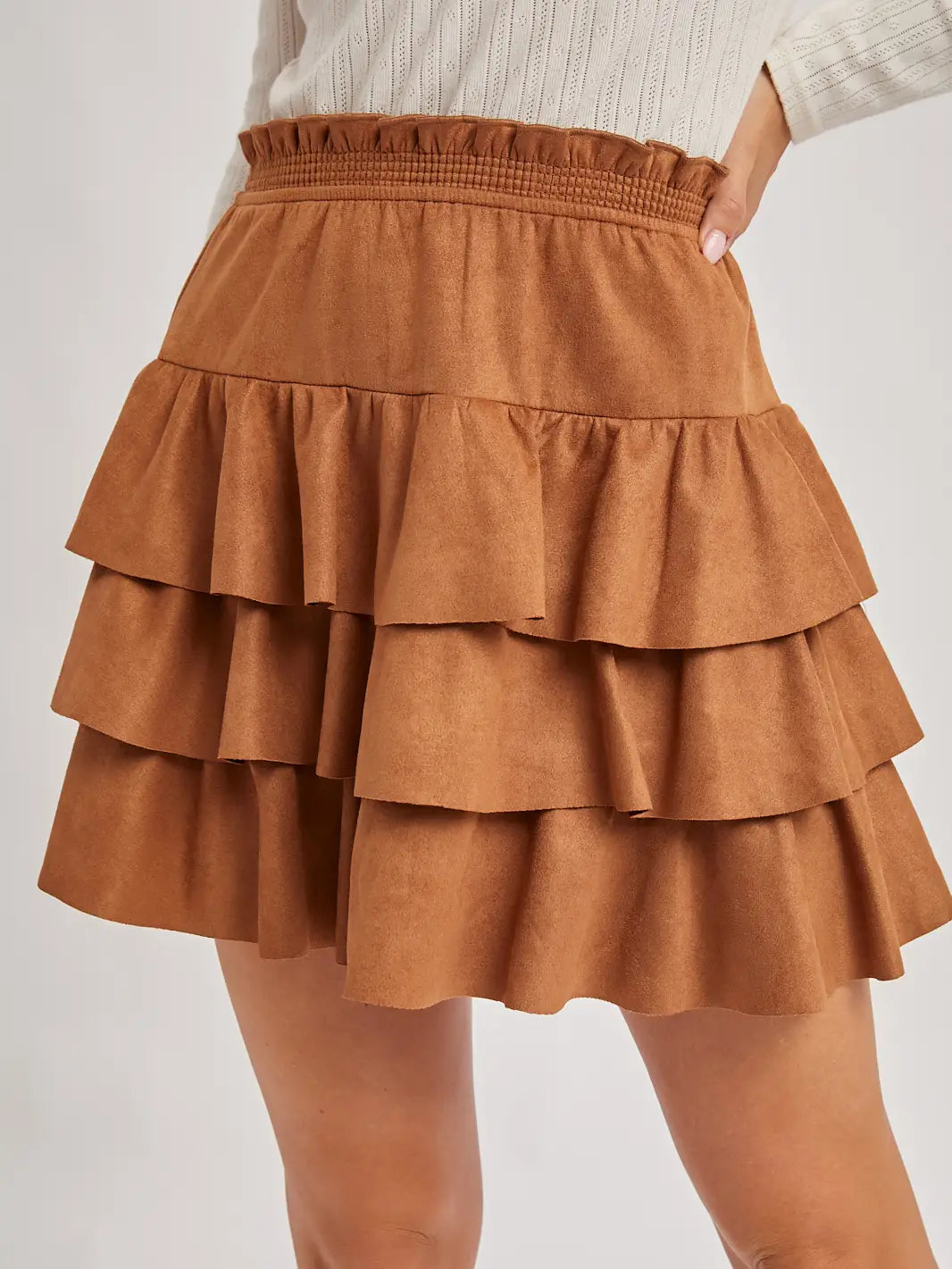 Embrace playful charm this fall with the Sadie Faux Suede Skirt. Made from soft camel faux suede, it features three tiers of flirty ruffles that sway with every step. The high-rise design and wide smocked paperbag waistband provide a comfy, flattering pull-on fit. Style it with a cozy knit sweater and boots for a look that’s effortlessly chic and full of fun.