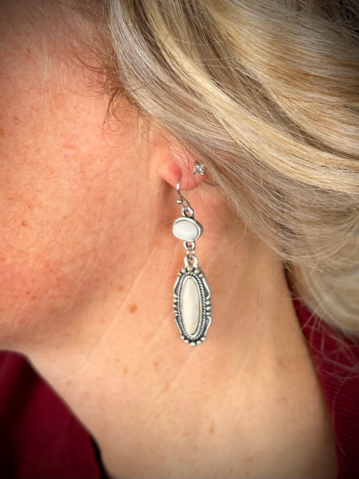 1.7" long white turquoise drop earrings with fishhook closure. Alloy metal and antique silver plate. Enhance your outfit anyday!