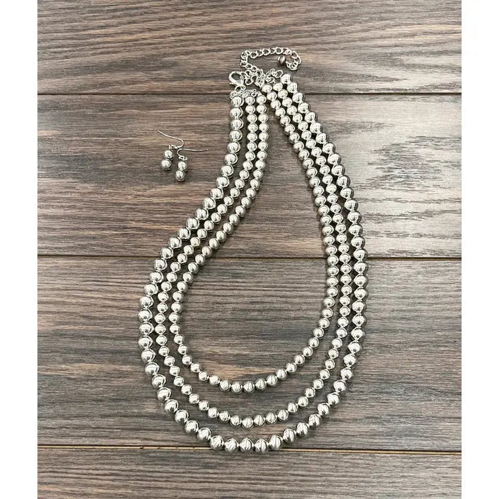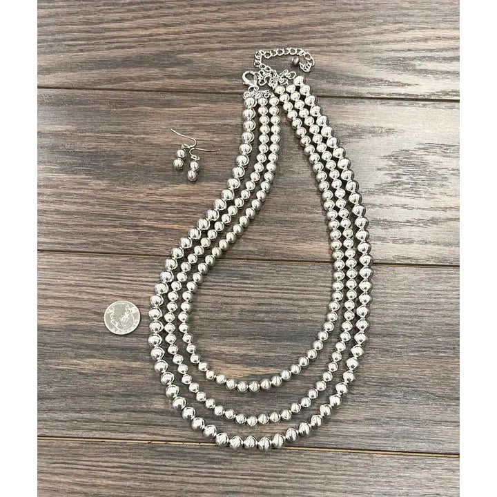 Add some Southwest flair to your wardrobe with our Shania Silver Bead Necklace Set! This handmade 3-strand silver Navajo bead necklace and earring set features varying lengths (24" to 29") for a versatile and stylish look. The lightweight design (90 grams) ensures all-day comfort, while the nickel, lead, and chrome-free materials provide peace of mind.