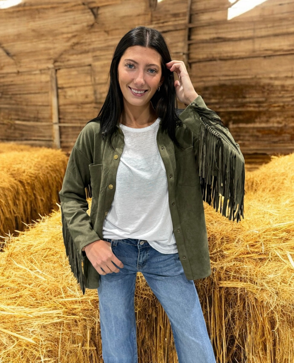 Step into style with the Shania Suede Shirt Jacket! This dark olive green jacket combines soft suede with playful fringe details for a look that’s both edgy and cozy. Featuring snap front closure and handy chest pockets, it’s perfect for layering. Made with a comfy polyester and spandex blend, it fits true to size and moves with you all day long. Add a dash of fun to your wardrobe with this standout piece!