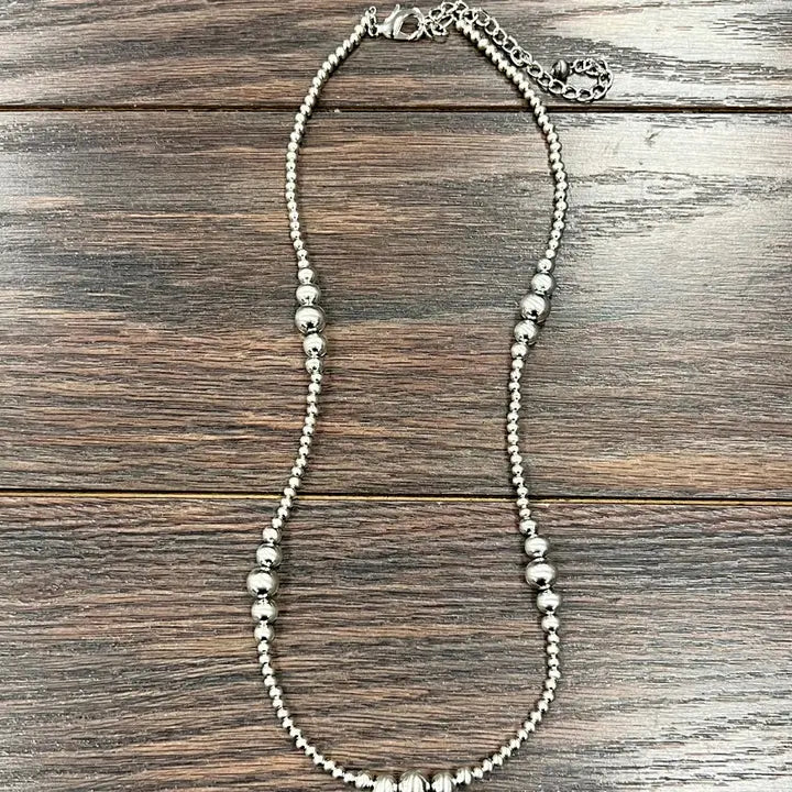 Feel and look fabulous with the Shantelle Silver Necklace! Handmade with exquisite 4mm and clustered 6mm, 8mm, and 10mm silver Navajo beads, this 22" long necklace (with a 5" extender) is the perfect addition to any outfit. Weighing in at just 15 grams, it's also nickel, lead, and chrome free for worry-free wear. Be the envy of your friends with this unique, high-quality necklace.