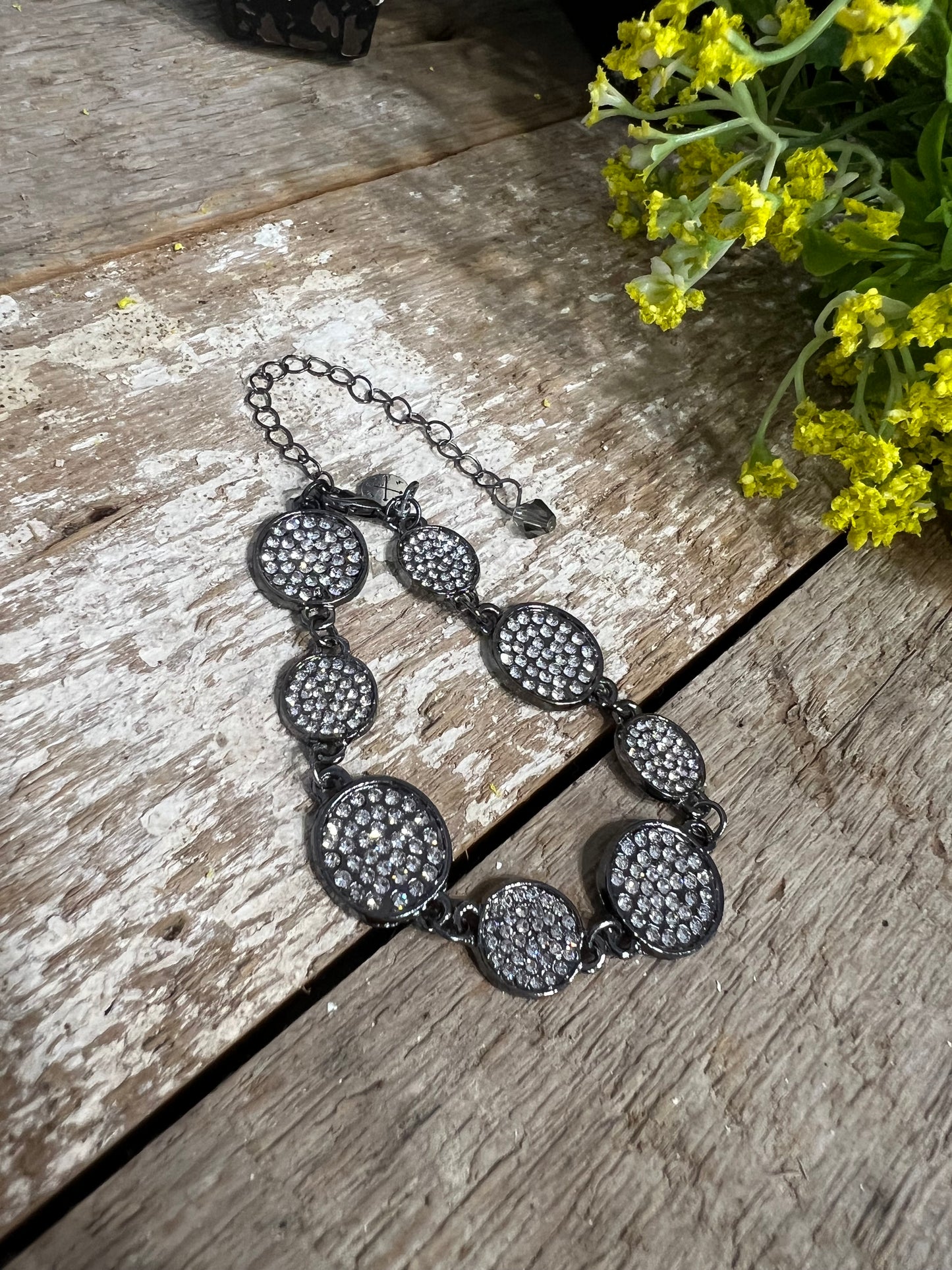 "Add some sparkle to your style with Shiney Things' sparkly bracelet. Featuring various sized circles adorned with dazzling rhinestones, this bracelet is the perfect accessory to elevate any look. You'll shine bright with every move!"