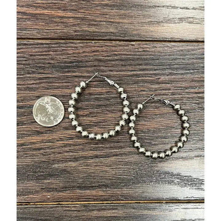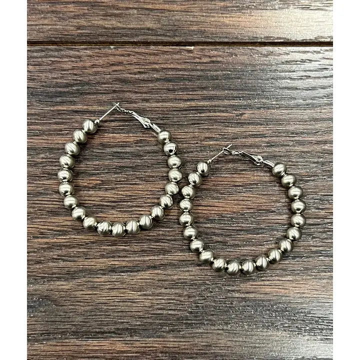 Add some southwestern flair to your accessory game with our Silver Navajo Bead Hoops! These 1.75" long earrings feature a 6mm silver Navajo bead and a 45mm hoop for a unique touch. Lightweight and nickel, lead, and chrome free, these French lock earrings are perfect for everyday wear. Howdy, stylish!