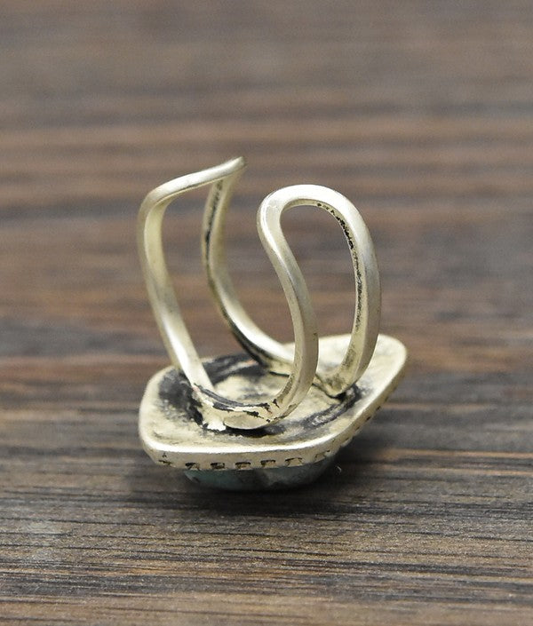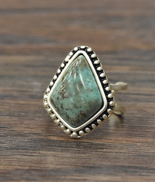 1" Long, Turquoise Ring, Brass Dual Adjustable Band * Natural stone may vary in size, color, or shape * One size, Adjustable by pulling/pushing brass dual band * 1" long * 12 grams weight * Turquoise on Alloy metal, Antique silver plate * Nickel, Lead & Chrome free