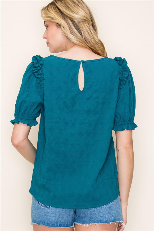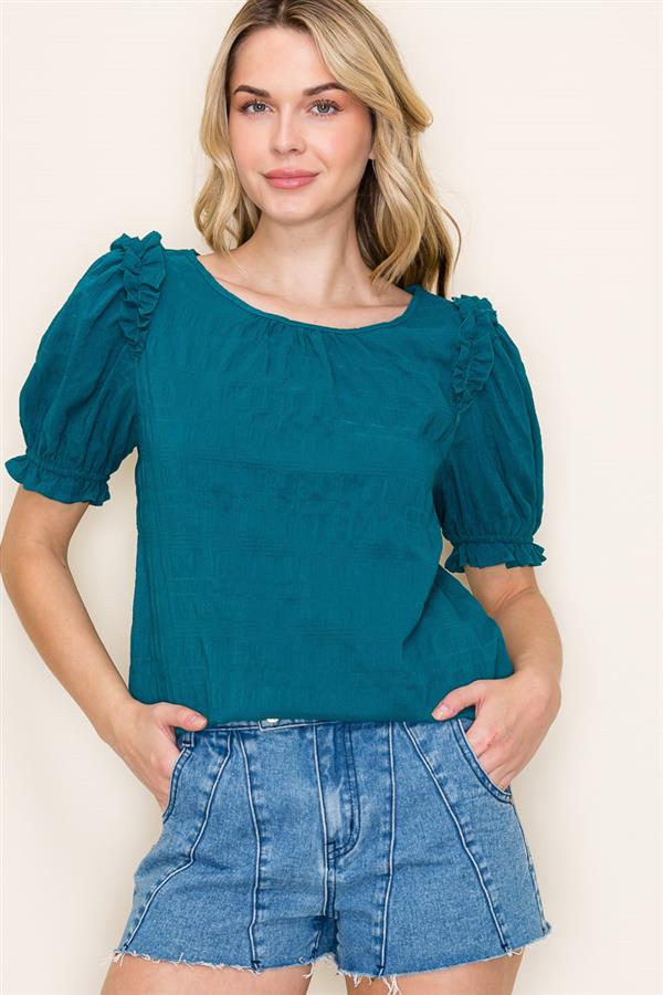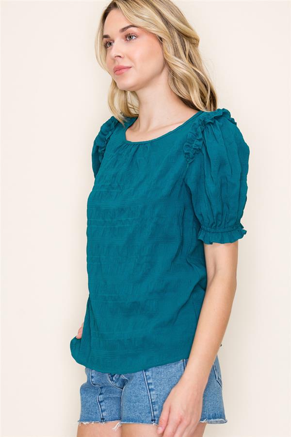 The Jade Blouse brings a playful twist to your wardrobe with its gathered neck and charming ruffle details. Featuring puff half sleeves with elastic hems and a crinkled texture, this poly/spandex top offers both comfort and style. Perfect for adding a flirty, fun vibe to any outfit!