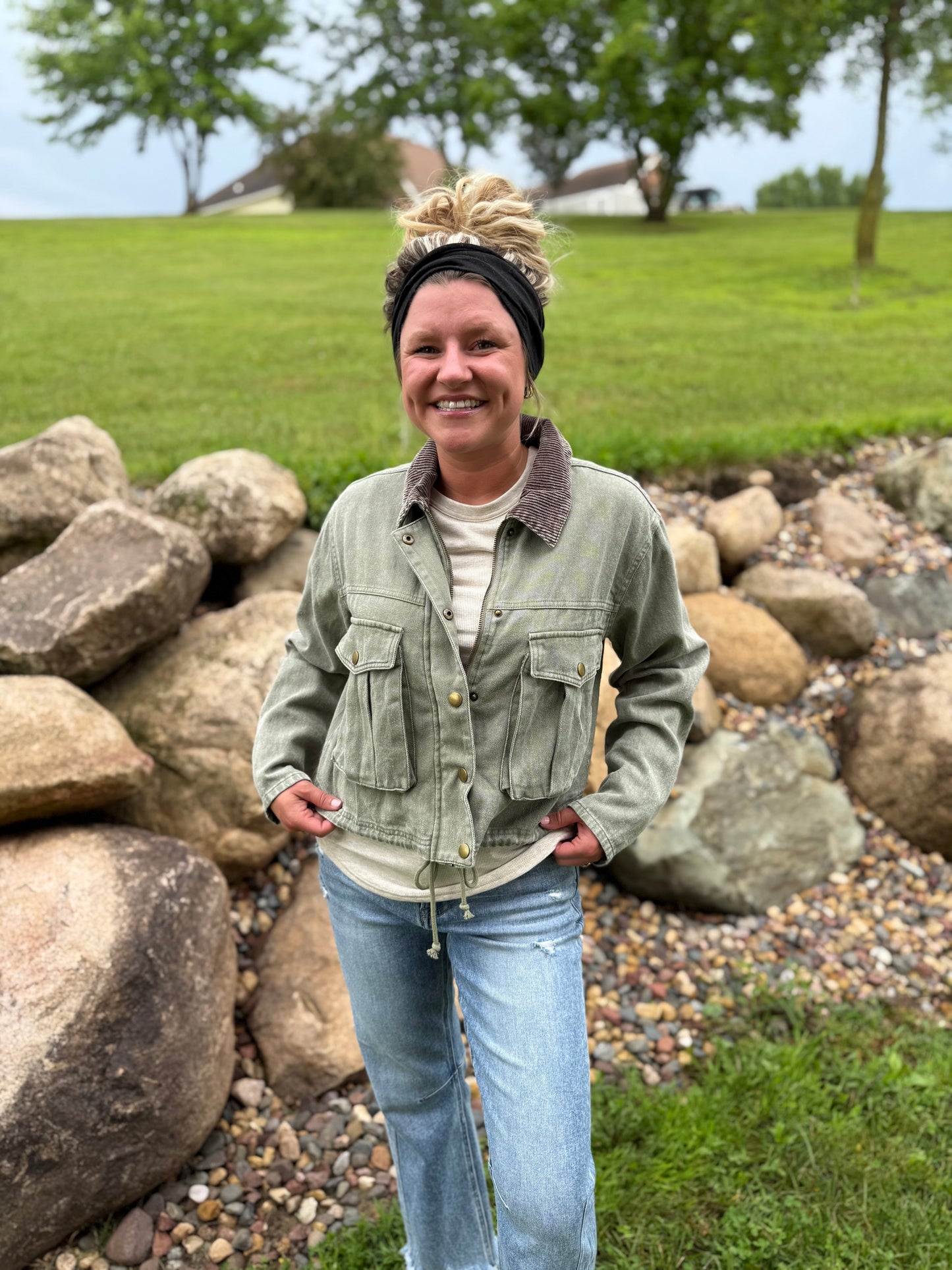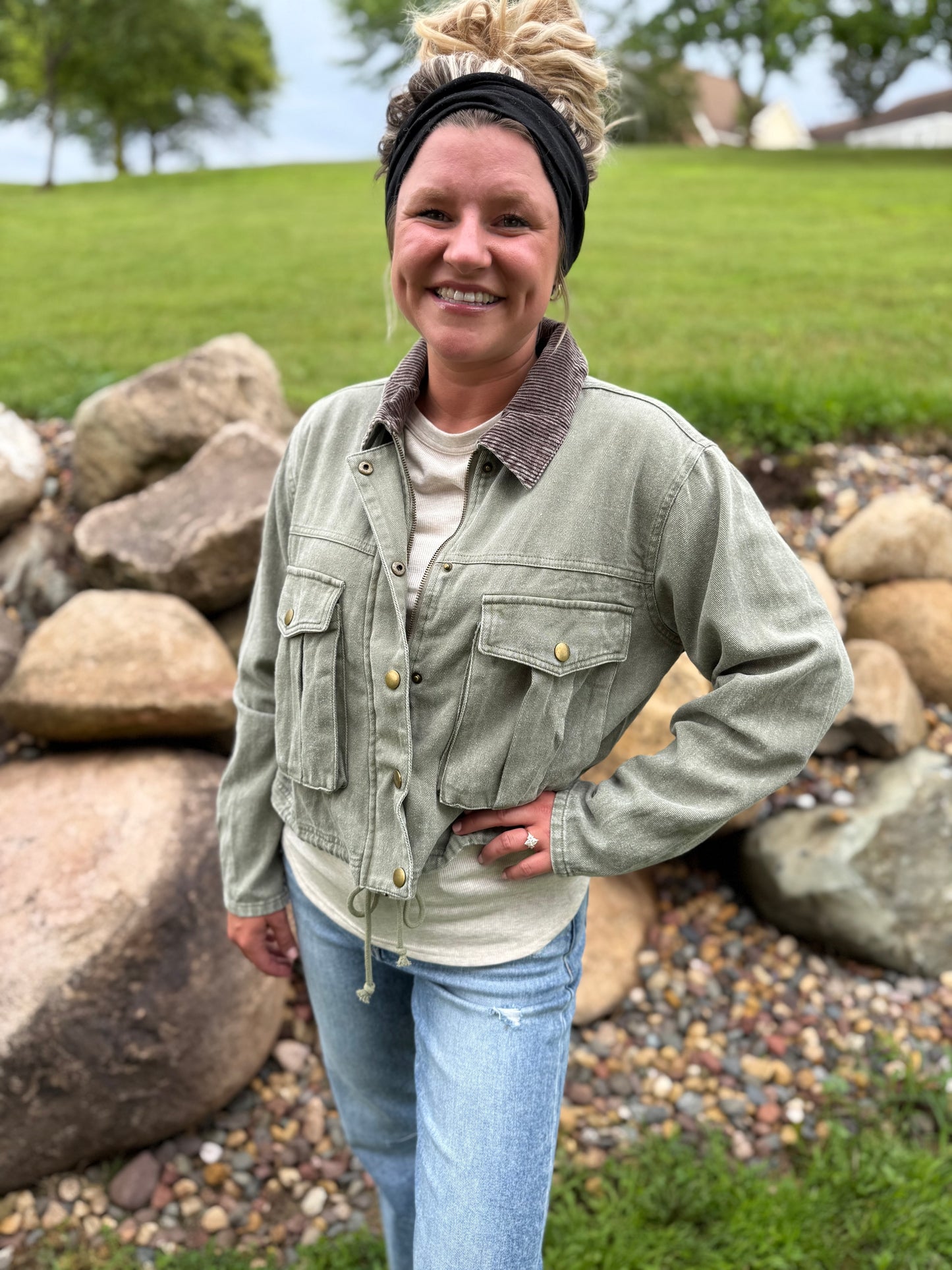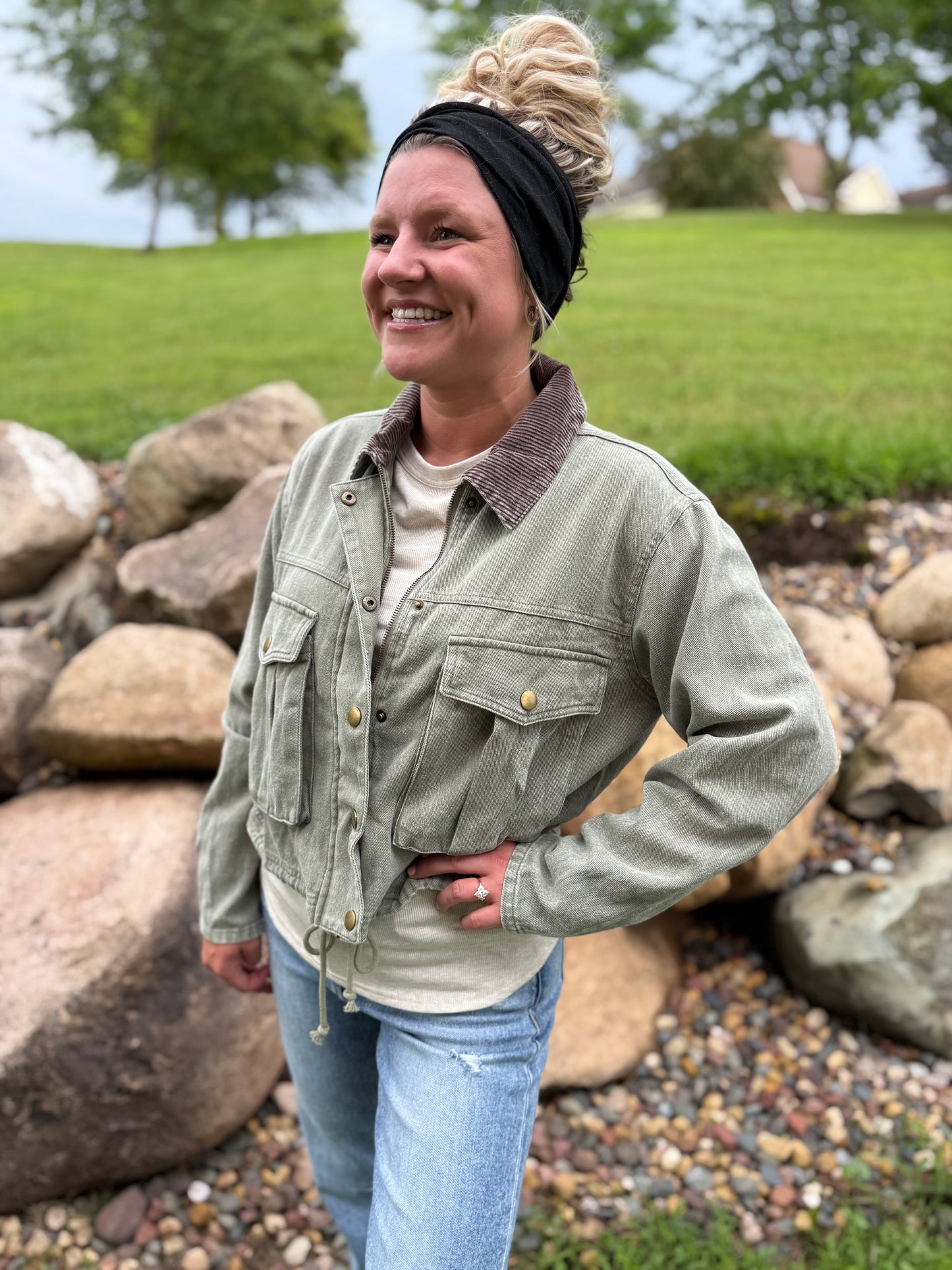 The Outback Twill Crop Jacket in Olive is a fun and stylish addition to your wardrobe. Featuring a cozy corduroy collar and a playful contrast twill design, this cropped jacket adds a fresh, textured look to any outfit. Perfect for layering, it’s your new favorite piece for casual adventures and laid-back days.
