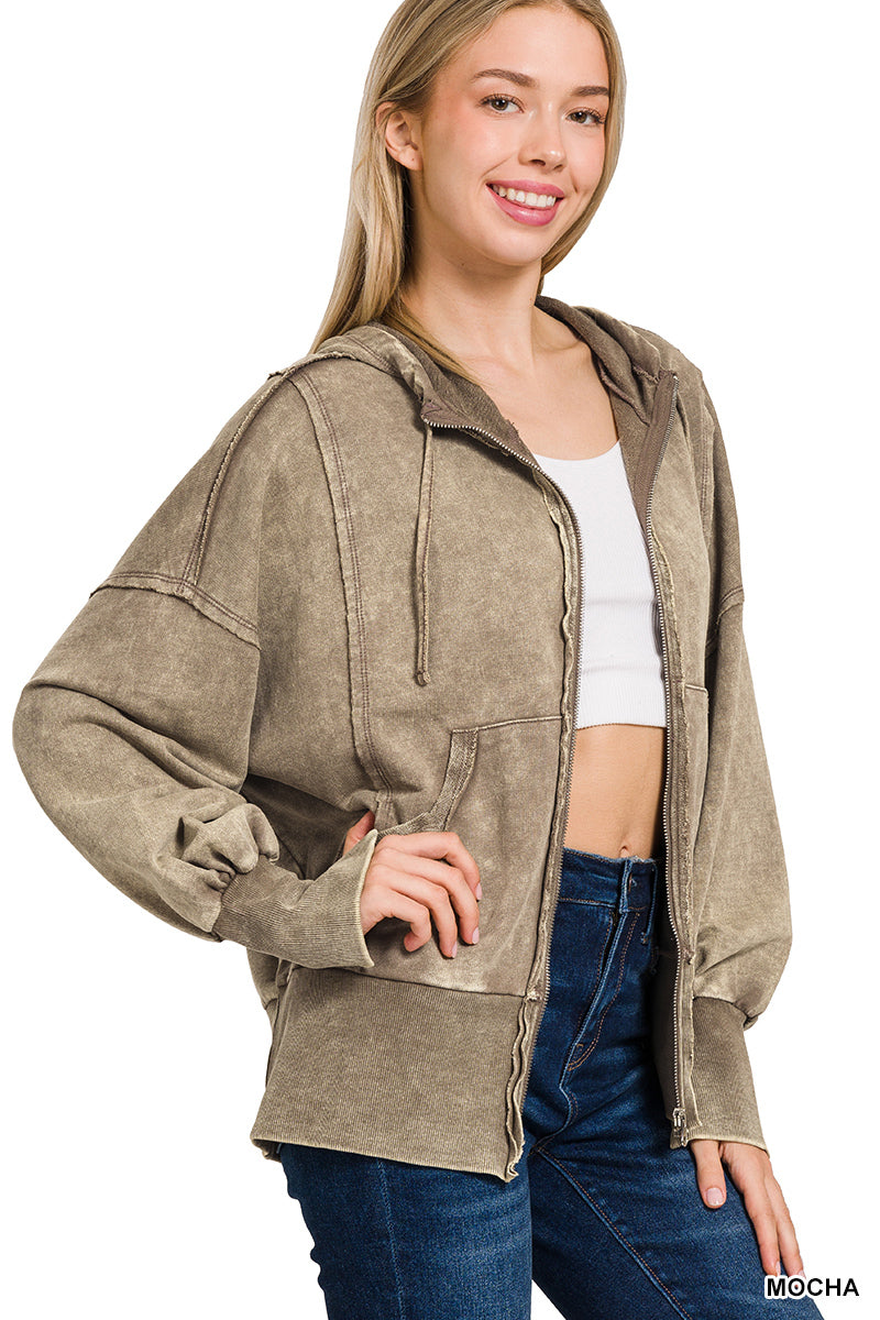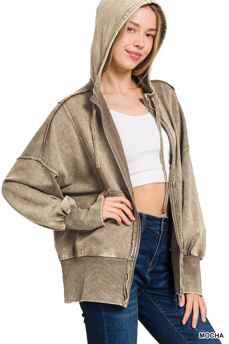 Paxton Acid Wash Zip Up Hoodie in Mocha