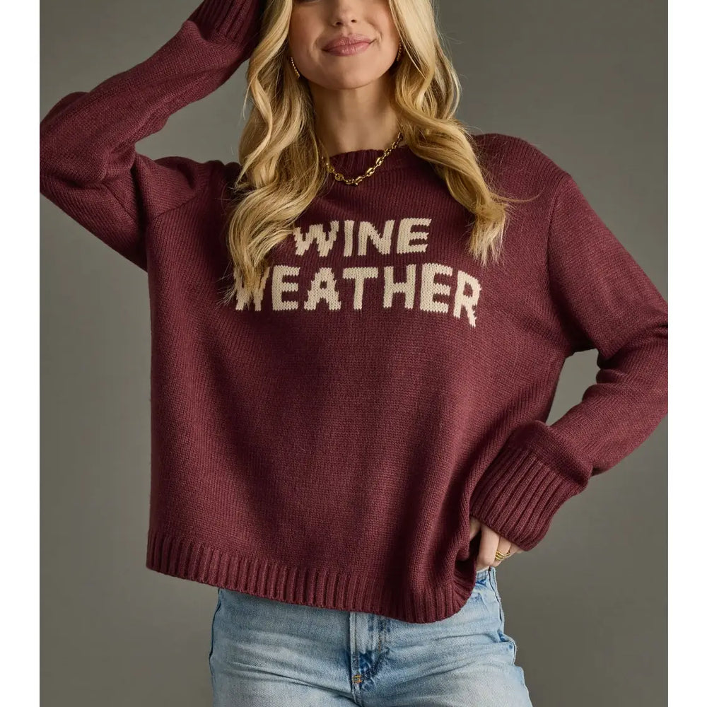 Cozy up in this wine-colored knit sweater, perfect for those chilly days when all you can think about is a good glass of wine. Crafted from soft, easy-care acrylic, it features playful "Wine weather" text across the front in a charming tan hue. The relaxed fit offers just enough room for comfort without sacrificing style, fitting true to size with a gentle, flattering drape. Your new go-to for casual comfort and a little humor.
