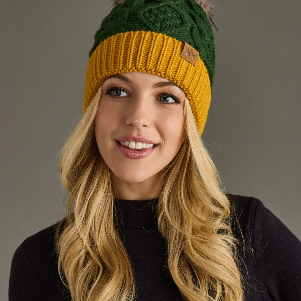 Add Green & Gold Trim Cable Knit Pom Hat to the cart