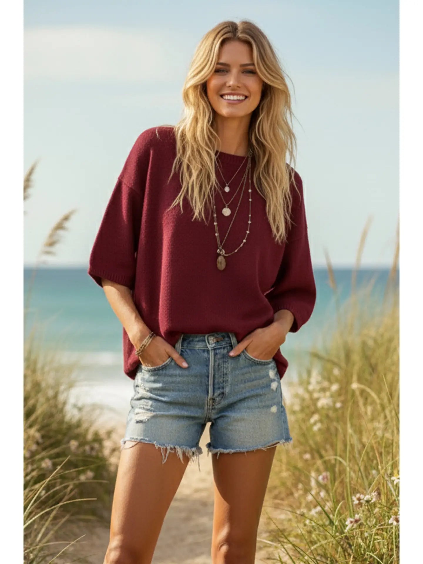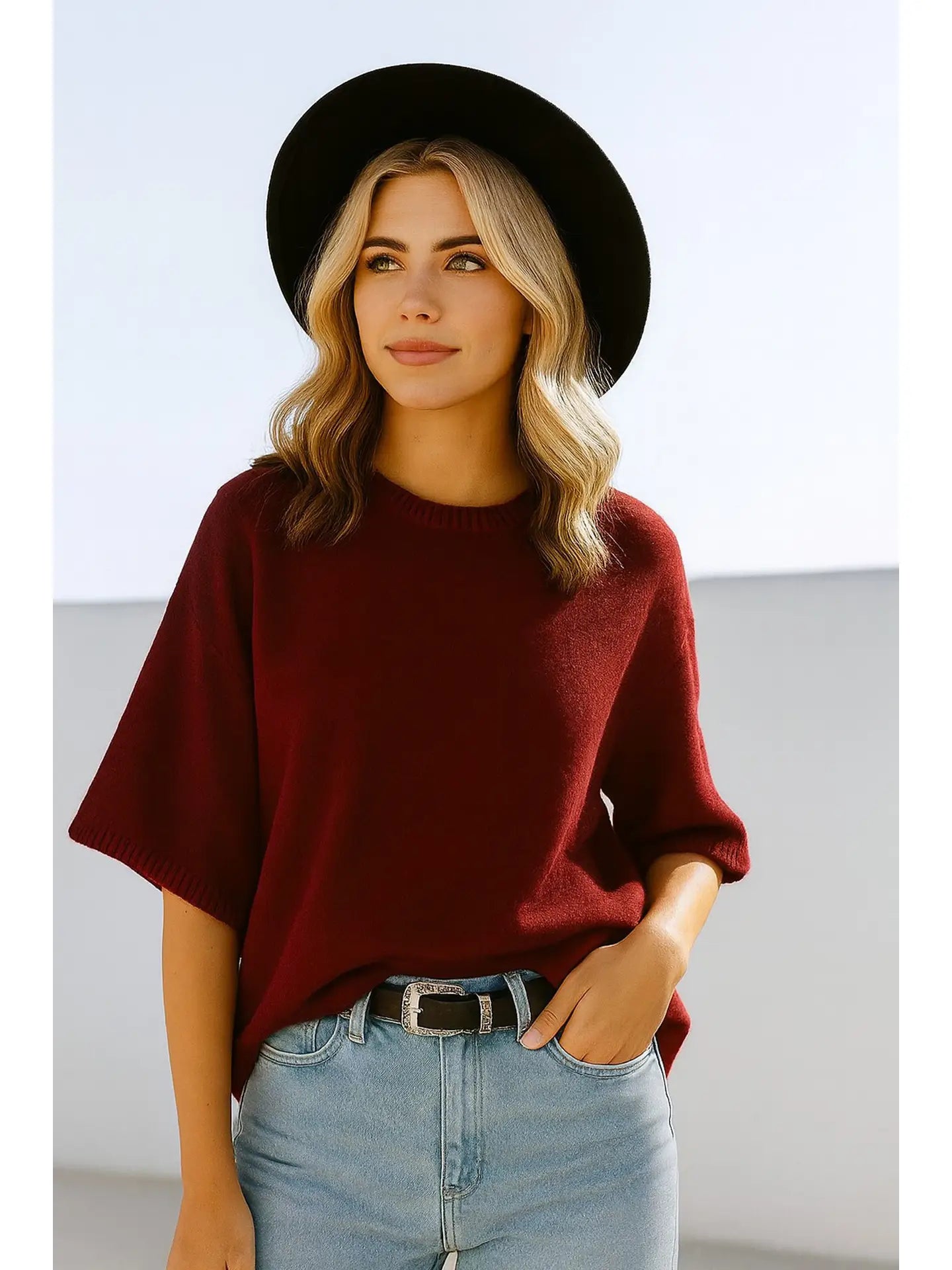 Bria Short Sleeve Relaxed Sweater in Burgundy or Taupe