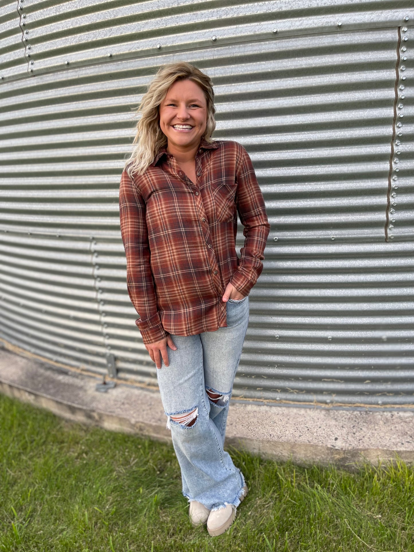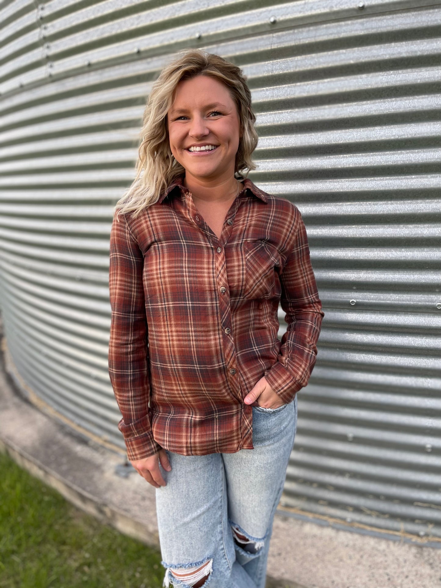 Regular price $30.99Add some color to your wardrobe with the Cadence Classic Flannel! This unique flannel shirt features a playful mix of burgundy, orange, and rust plaid. The button-down front and front chest pocket add functionality to this stylish piece. Perfect for staying cozy and trendy.