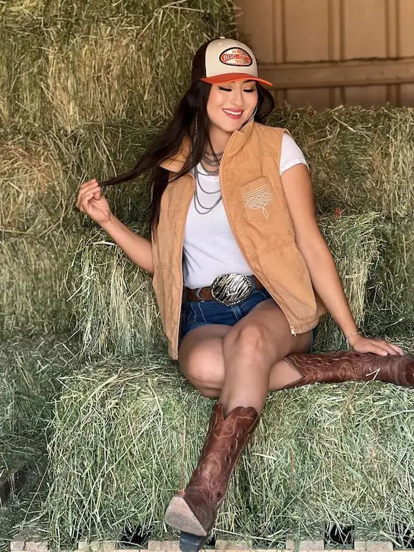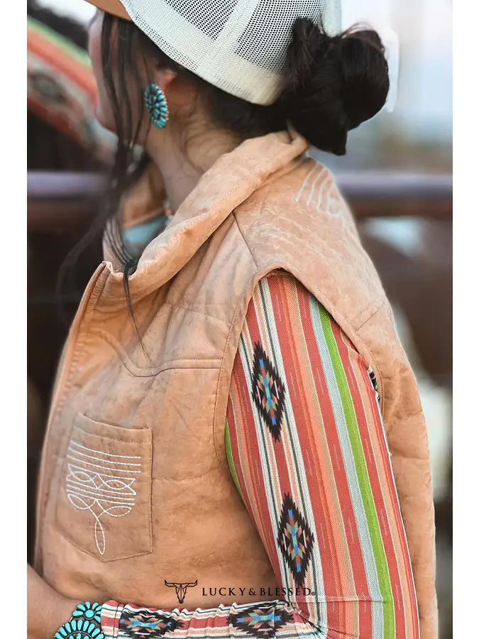 Stay cozy and stylish with Cady's Camel Puffer Vest! This solid zip-up vest features a fun printed Aztec lining and charming boot stitching details. With handy side pockets and a true-to-size fit, it’s perfect for layering on chilly days while adding a pop of personality to your outfit.