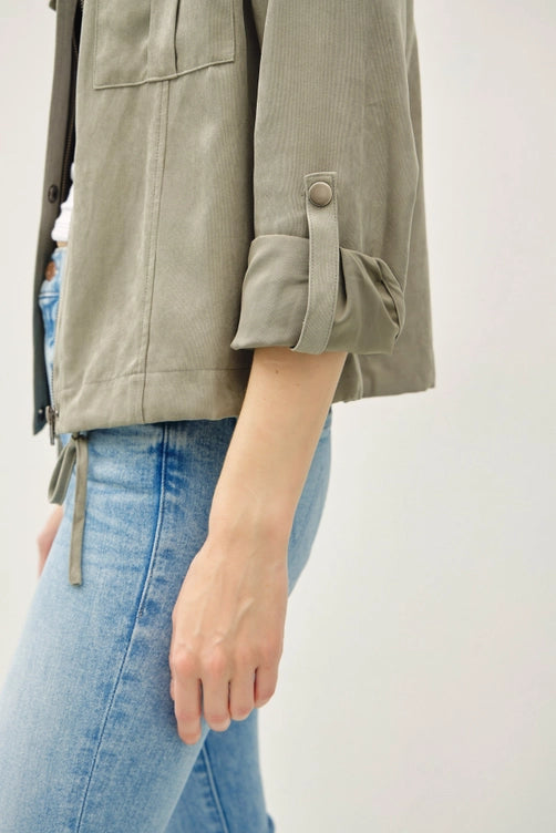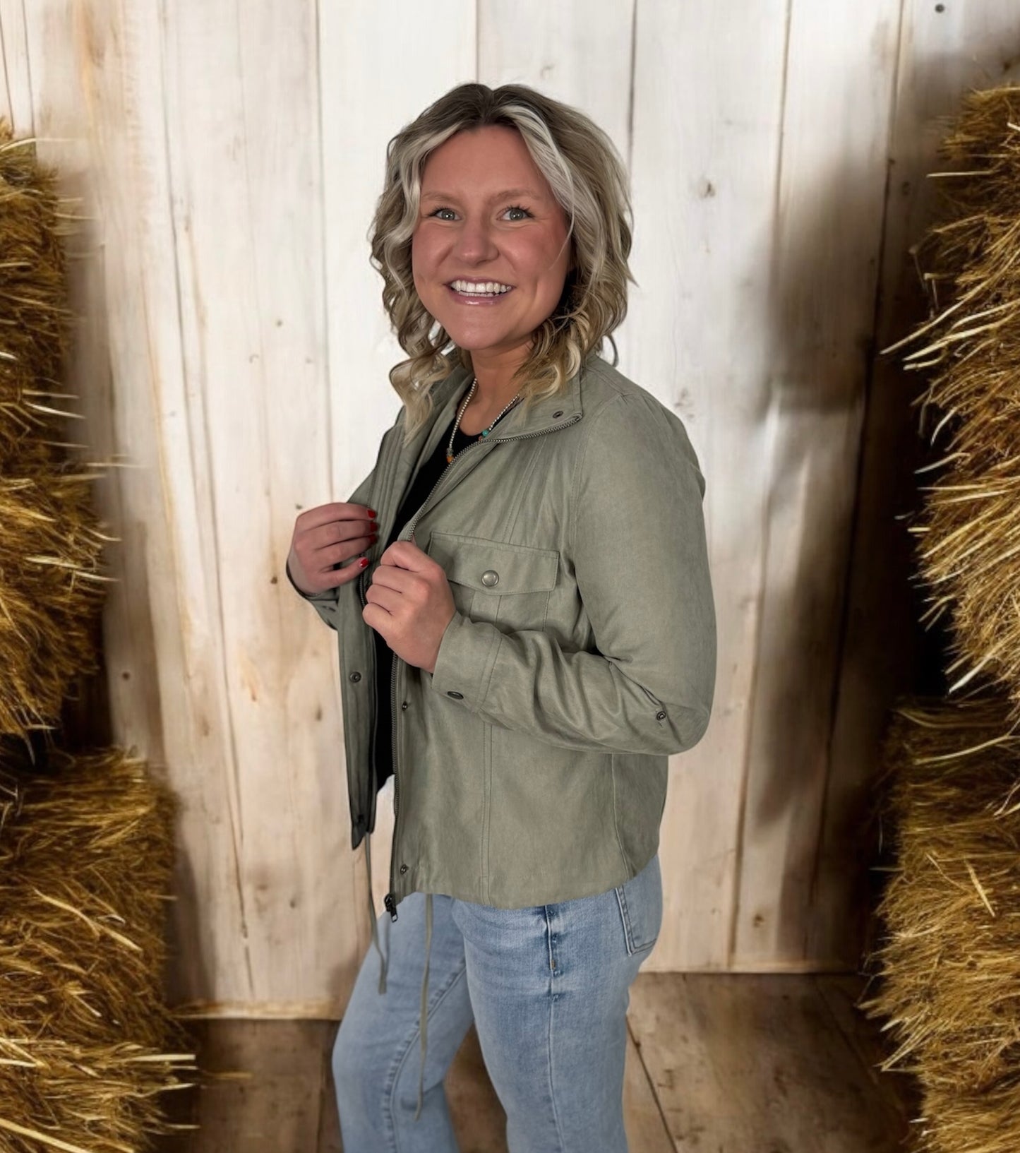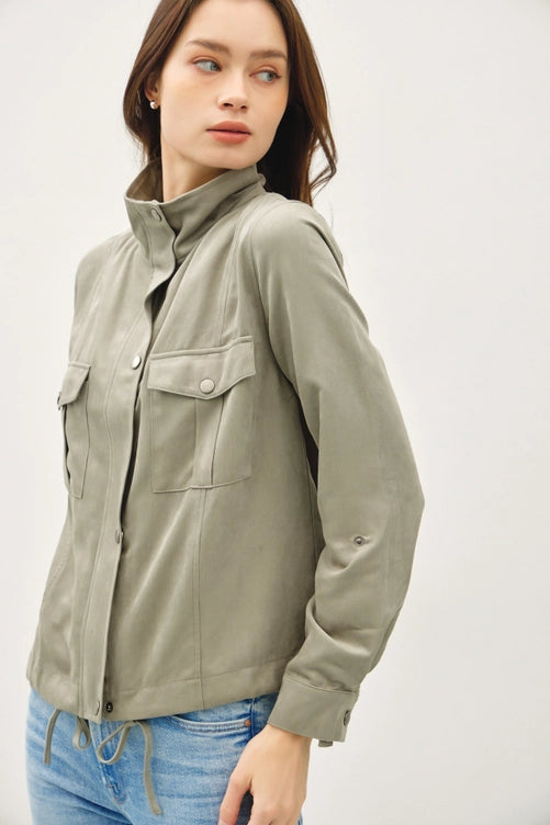 Get ready for spring and fall in style with Cara's Cropped Utility Jacket in dusty sage. This quirky safari-inspired jacket features a high neck and high collared design, perfect for keeping you warm on those breezy days. With a front zipper and button closure, flap chest pockets, and snap button details on the sleeves, this jacket is as functional as it is fashionable. Plus, the drawstring at the hem line adds a playful touch. Made from extremely soft material, this cropped jacket is a casual must-have for any wardrobe.