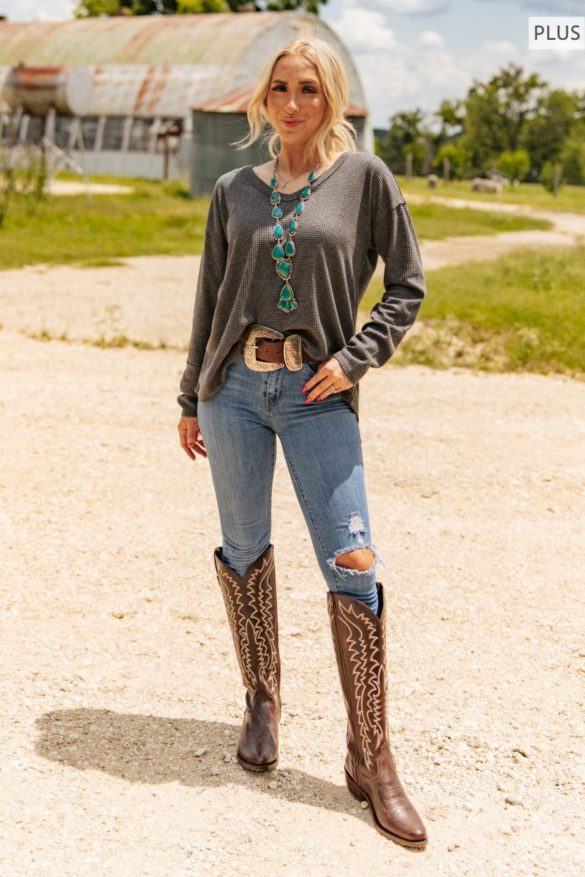 The Harlow Thermal Top in Black combines elegance with comfort, crafted from a soft, stretchy thermal knit blend of 77% polyester and 23% rayon. Its long sleeve V-neck design offers a flattering silhouette, ideal for layering or wearing alone. Lightweight yet warm, this non-sheer top ensures both style and practicality for cooler days.