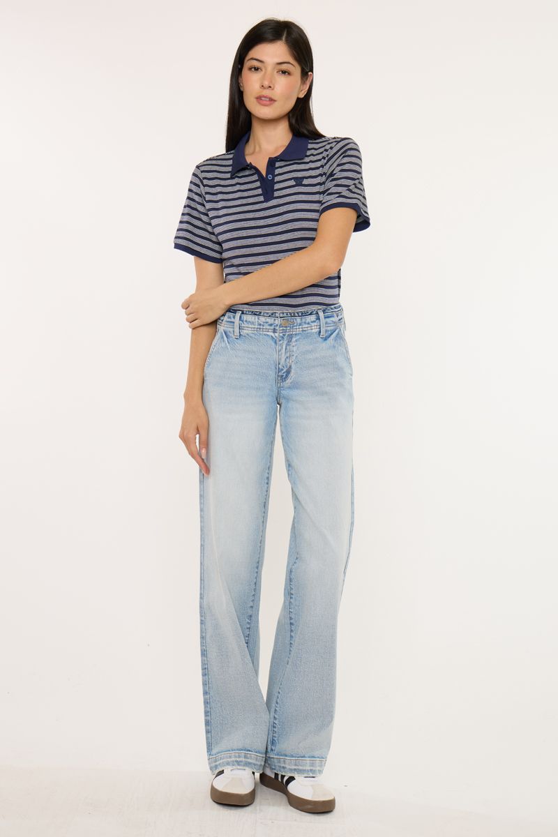 Meet your new go-to trouser! The Mazie Mid Rise Wide Leg features a flattering mid-rise cut with a chic wide-leg silhouette that's perfect for dressing up or down. Crafted from a soft cotton-spandex blend with comfort stretch, these trousers move with you all day long. The light wash pairs beautifully with color-block details and functional pockets, while the zip fly with button closure keeps everything secure. Non-distressed and effortlessly polished—your wardrobe just got an upgrade!